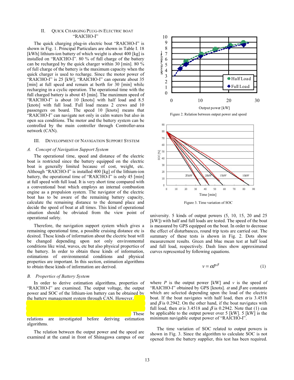 东京海洋科技大学制造了一种名叫RACHO-I的快速充电即插式电动船舶。RACHIO-I是第一艘采用CHAdeMO标准的电动船舶。CHAdeMO是日本的快速充电标准。然而,航行支持系统(NSS)从操作安全的角度来看是电动船舶的重要技术之一,它给剩余的操作时间一个可能的巡航距离等等。在这篇文章中,提出了一种航行支持系统的用于估计电荷的状态,剩余的运行时间等的算法。还提出了通过获得建议的速度,以巡航所需距离的算法。