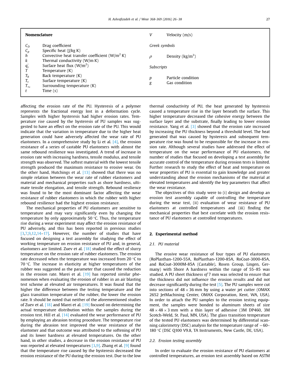 聚氨酯弹性体的力学性能对温度很敏感,甚至可以通过将温度仅改变大约50°C,而发生显著变化,因此,磨损试验期间的温升可能会对聚氨酯的抗侵蚀性能产生不利影响,这在以往的研究中作过报道[3,7,9,12,14-17]。然而,专注于设计一个测试组件,以研究工作温度对聚氨酯和一般弹性体抗侵蚀性能的影响,但研究的数量有限。Zuev等人[18]。研究了浆料温度对橡胶弹性体冲蚀率的影响。当温度从20°C提高到70°C时,磨损率下降,橡胶在较高温度下增加弹性被认为是导致侵蚀速率降低的参数。Marei等人[19]。报道了在空气温度升高的情况下评估空气爆炸试验方案中橡胶侵蚀的相似现象。结果表明,橡胶的测试温度与玻璃化转变温度的差值越大,侵蚀速率越低。应当指出的是,上述关于Zuev等人的研究都没有[18]。和Marei等人[19]。着重于在确定侵蚀试验期间样品内的实际温度分布。Hill等人。[14]通过采用磨损试验工序评估聚氨酯的磨损性能。磨损测试期间的温升提高了弹性体的耐磨性,这是由于聚氨酯在高温下软化和硬度降低所致。另一方面,在其他研究中,随温度升高聚氨酯的抗侵蚀性下降[3,9]。Zhang等人[9]。在侵蚀实验中,发现滞后引起的温度上升降低了聚氨酯的抗侵蚀性能。由于聚氨酯的低导热性,滞后产生的热量会导致表面下层中的温度升高。这种较高的温度降低了表层与基体之间的结合能,最终导致抗侵蚀性降低。Yang等人[3]。结果表明,通过增加聚氨酯厚度超过阀值水平,侵蚀速率增加。发现由迟滞和随后的温升引起的热量是侵蚀速率增加的原因。虽然有几项研究已经解决了温度对聚氨酯弹性体磨损性能的影响,但专注于开发用于在侵蚀期间精确控制温度的测试组件的研究数量是有限。进一步研究热和温度对聚氨酯材料磨损性能的影响,对于获得有关材料在高温下侵蚀机理的知识和更深入的了解并确定影响耐磨性的关键参数至关重要。