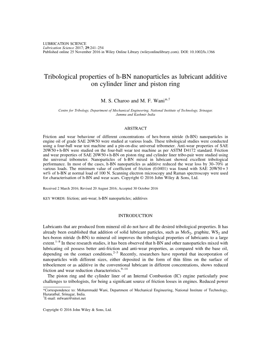 Centre for Tribology, Department of Mechanical Engineering, National Institute of Technology, Srinagar, Jammu and Kashmir India