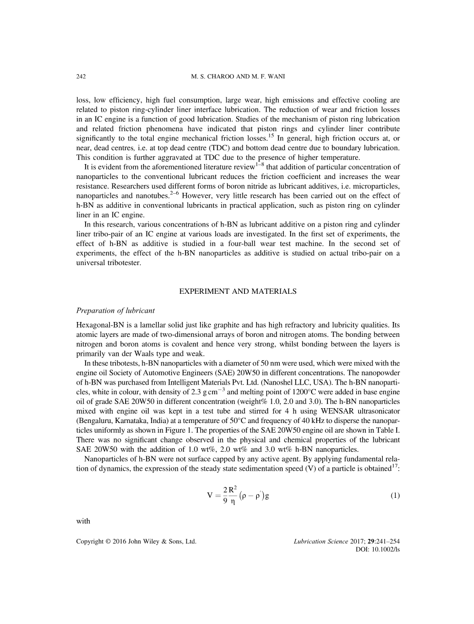 内燃(IC)机的活塞环-缸套组件作为发动机摩擦磨损的重要来源对研究人员来说是一项特别的挑战,降低功率损耗、低效率、高油耗、大磨损、高排放和有效冷却都与活塞环-缸套界面润滑有关。良好的润滑能使内燃机的磨损和摩擦损失减少,活塞环的润滑机理和摩擦现象的研究表明,总发动机的机械摩擦损失明显来自于活塞环-缸套组件15。一般来说,高强度的摩擦一般发生在边界润滑附近的死中心,即上止点或下止点。由于高温的存在,这种现象在上止点更加剧烈。从上述文献可以看出1-8,在常规润滑剂中加入特定浓度的纳米颗粒可以降低摩擦系数并增加磨损抗性。研究人员使用不同形式的氮化硼作为润滑油添加剂,即微粒,纳米粒子和纳米管2-6。然而,在实际应用中h-BN纳米微粒作为添加剂实施在润滑油添加剂中是非常少的。如内燃机的活塞环-缸套组件。