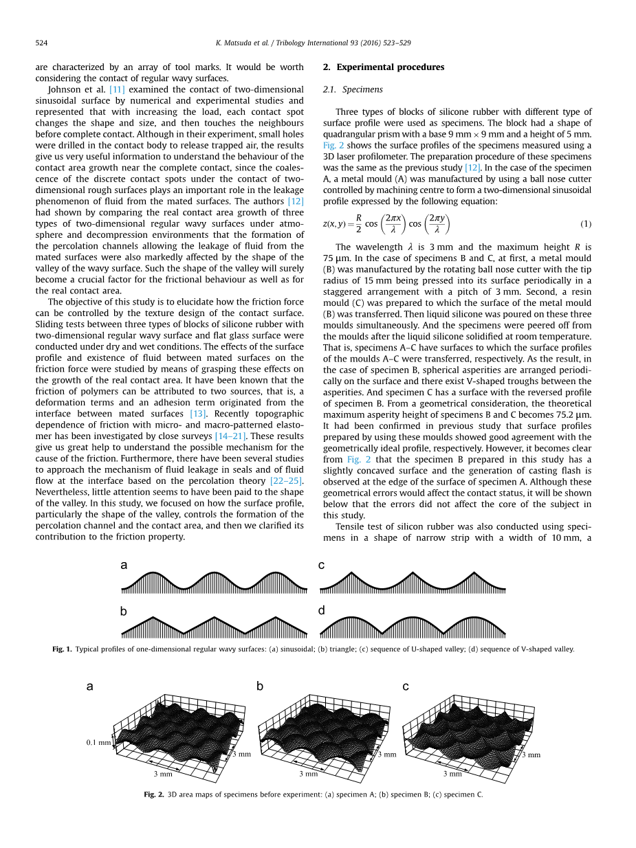 本研究的目的是阐明摩擦力如何通过接触面的纹理设计来控制。在干燥和潮湿条件下,对三种硅橡胶块与二维规则波状表面和平板玻璃表面进行了滑动试验。通过掌握真实接触面积的增长,研究了摩擦副表面轮廓和流体存在对摩擦力的影响。众所周知,聚合物的摩擦可以归结为两个来源,一个变形项和一个粘着项起源于配对表面之间的界面[13].最近通过密切调查[14-21]研究了微观和宏观图案化弹性体摩擦的地形依赖性。这些结果对我们理解摩擦产生的可能机制有很大的帮助。此外,已有一些研究基于渗流理论[22-25]来探讨密封中流体泄漏的机理和界面上的流体流动。尽管如此,似乎没有人注意到山谷的形状。在这项研究中,我们专注于表面轮廓,特别是山谷形状如何控制渗流通道的形成和接触面积,然后我们澄清了它对摩擦性能的贡献。
