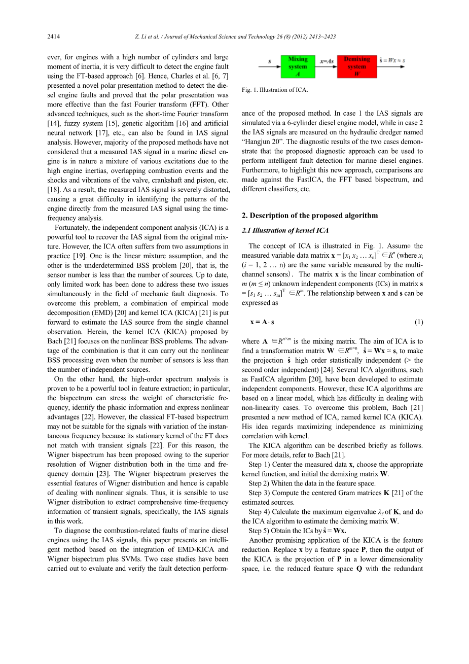 幸运的是,独立分量分析(ICA)是从原始混合物中恢复IAS信号的强大工具。 然而,ICA在实践中经常遭受两个假设[19]。 一个是线性混合假设,另一个是欠定BSS问题[20],即传感器数量少于源数量。 迄今为止,在机械故障诊断领域,同时解决这两个问题的工作只做了有限的工作。 为了克服这个问题,提出了经验模式分解(EMD)[20]和核ICA(KICA)[21]的组合来估计来自单通道观测的IAS源。 这里,Bach [21]提出的内核ICA(KICA)着重于非线性BSS问题。 advan-