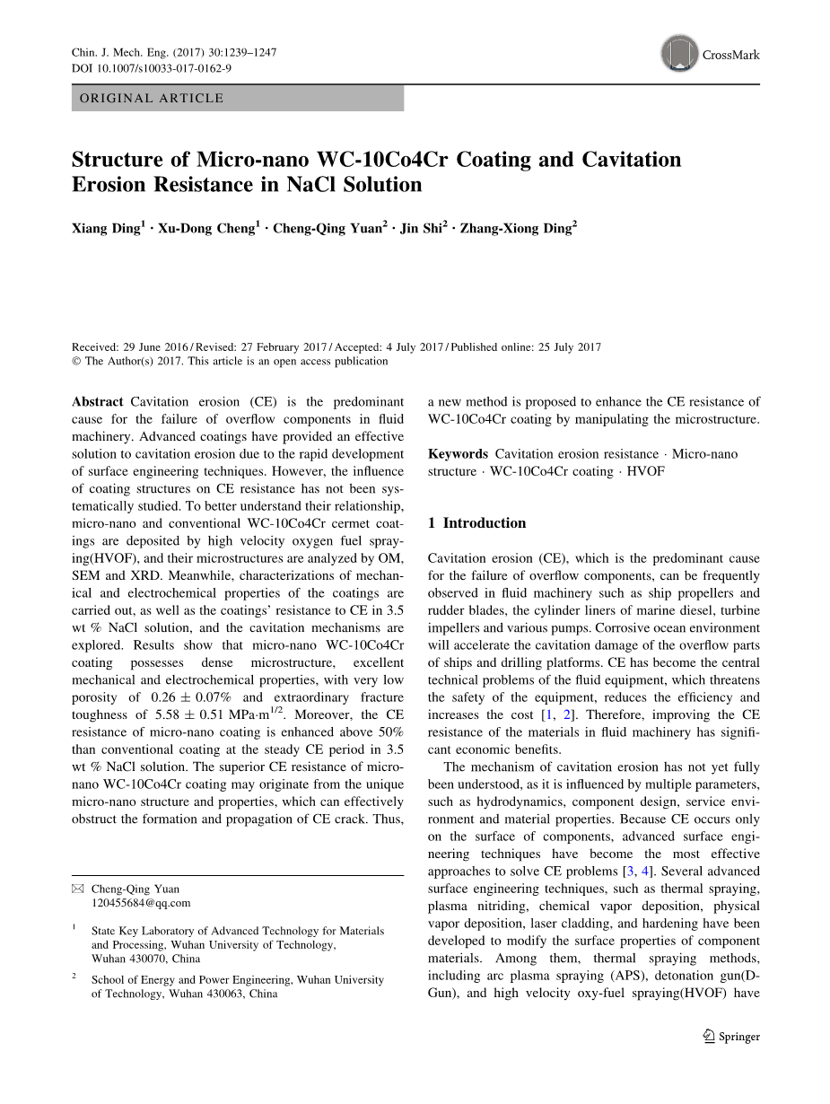 表面工程技术。 然而,涂层结构对CE耐受性的影响尚未得到系统研究。 为了更好地理解它们之间的关系,采用高速氧燃料喷涂法(HVOF)沉积了微纳米和常规WC-10Co4Cr金属陶瓷涂层,并通过OM,SEM和XRD分析了它们的微观结构。 同时,进行了涂层力学性能和电化学性能的表征,以及3.5%NaCl溶液中涂层对CE的耐受性,并探讨了空化机理。 结果表明,微纳米WC-10Co4Cr涂层具有致密的微观结构,良好的力学和电化学性能,孔隙率极低,为0.26plusmn;0.07%