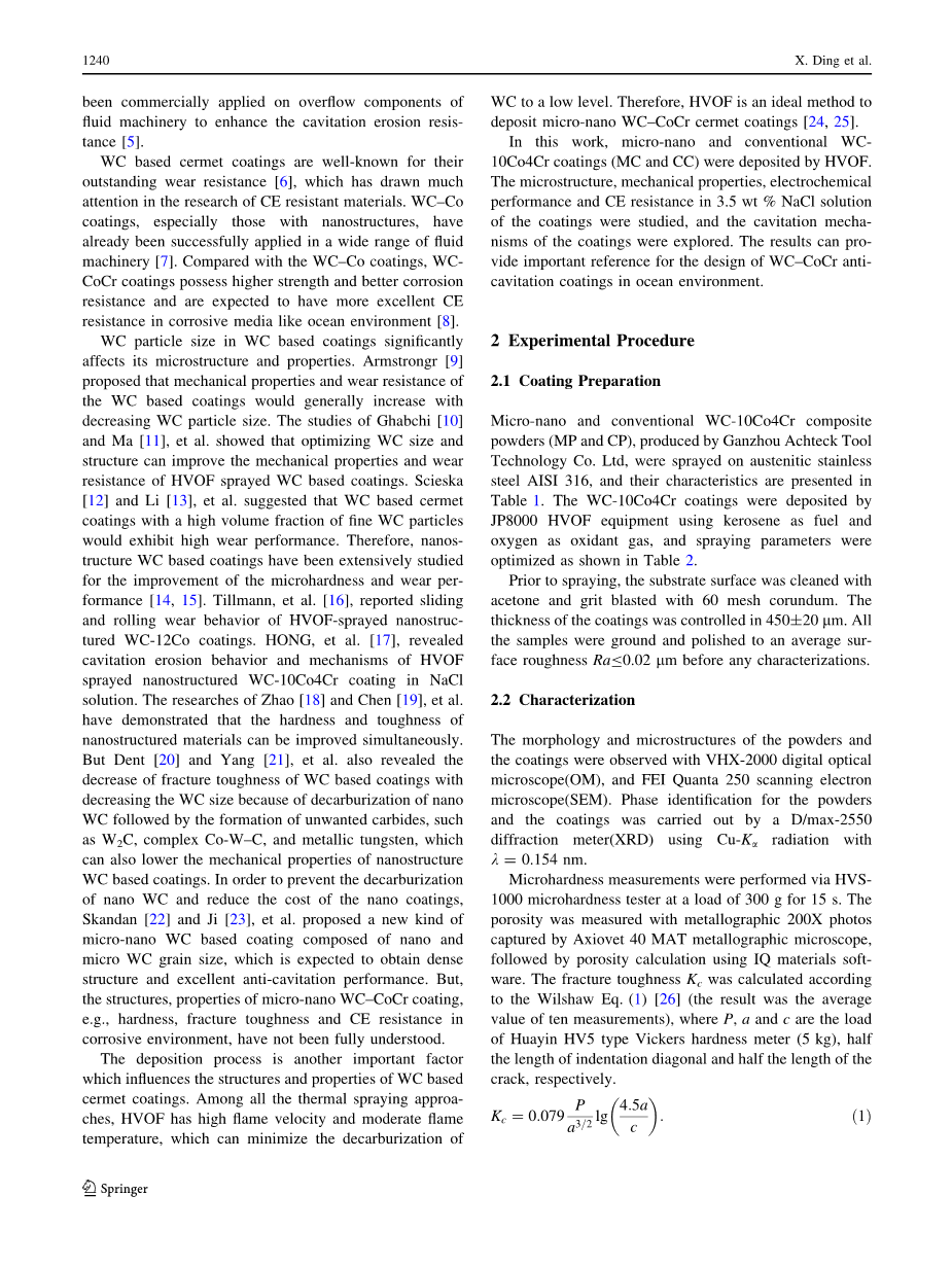 [12]和李[13]等, 建议WC体积分数较高的WC颗粒金属陶瓷涂层具有较高的磨损性能。 因此,纳米结构WC基涂层已被广泛研究用于提高显微硬度和磨损性能[14, 15]。 蒂尔曼等人 [16]报道了HVOF喷涂纳米结构WC-12Co涂层的滑动和滚动磨损行为。 洪,等。 [17]揭示了HVOF喷涂纳米结构WC-10Co4Cr涂层在NaCl溶液中的空化侵蚀行为和机理。 赵的研究[18]和陈[19]等, 已经证明纳米结构材料的硬度和韧性可以同时得到改善。 但是Dent [20]和杨[21]等, 由于纳米WC的脱碳,随后形成不需要的碳化物,如W2C,复合Co-W-C和金属钨,WC涂层的断裂韧性随着WC尺寸的减小而降低也可以降低纳米结构WC基涂层的机械性能。 为了防止纳米WC的脱碳并降低纳米涂层的成本,Skandan [22]和吉[23]等, 提出了一种由纳米和微米WC颗粒尺寸组成的新型微纳米WC基涂层,预期其具有致密的结构和优异的抗汽蚀性能。 但是,微纳米WC-CoCr涂层的结构,性能,如腐蚀环境下的硬度,断裂韧性和CE耐受性尚未完全了解。