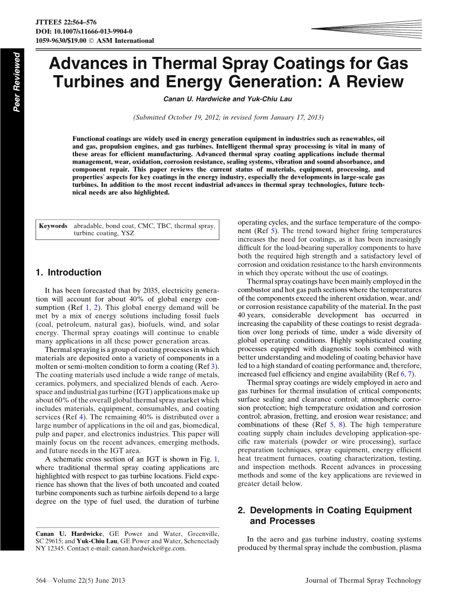 摘要:功能涂层广泛用于可再生能源,石油和天然气,推进发动机和燃气轮机等能源发电设备的各个领域。智能热喷涂加工在高效制造的这些领域非常重要。先进的热喷涂涂层应用包括热能管理,磨损,氧化,耐腐蚀,密封系统,振动和吸声以及部件修理。本文回顾了能源行业关键涂料的材料,设备,加工和性能方面的现状,特别是大型燃气轮机的发展情况。除了最新的热喷涂技术的工业进步之外,未来的技术需求也得到了强调。