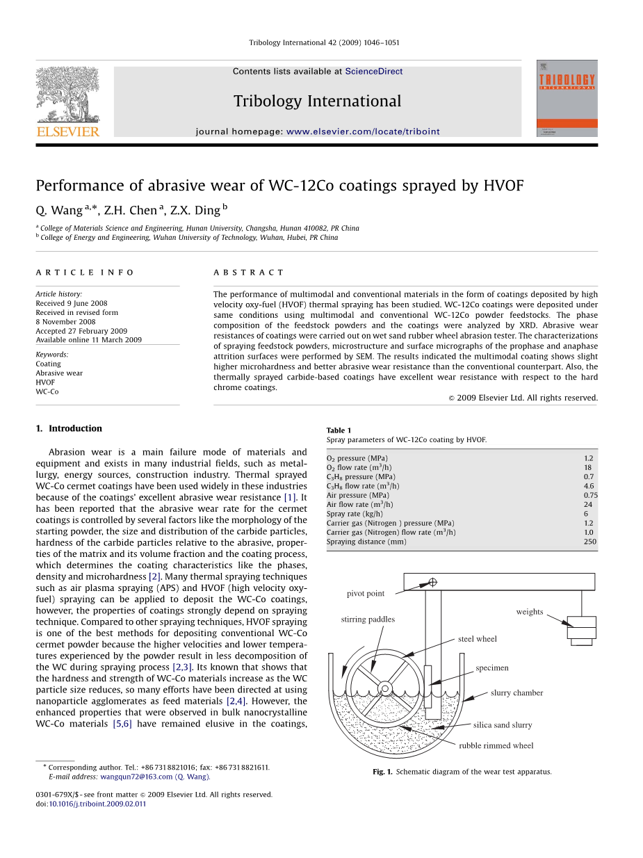 HVOF喷涂WC-12Co涂层的磨损性能外文翻译资料