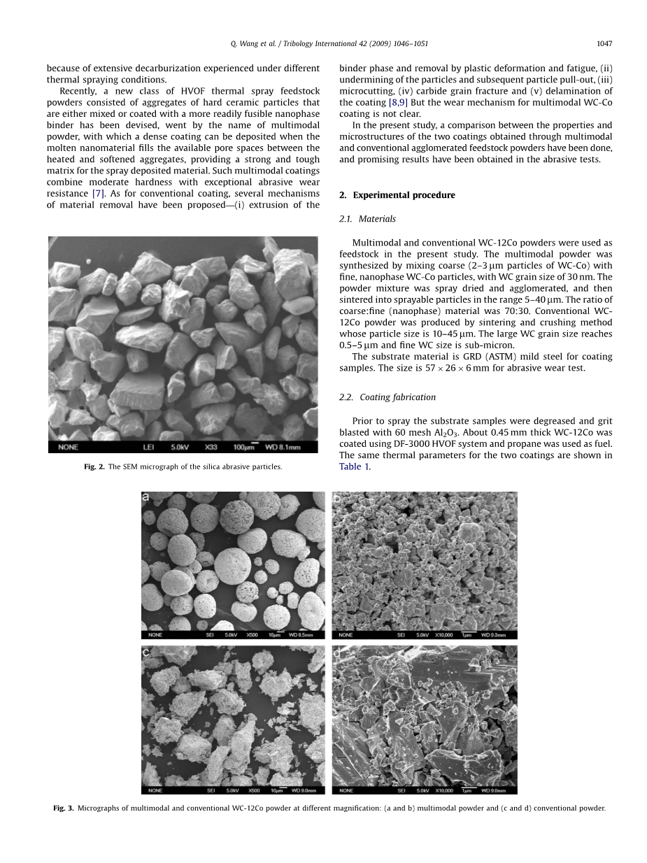 最近,一种新型的名为多模粉末的HVOF热喷涂原料粉末被设计了出来。这种粉末由硬陶瓷颗粒的聚集体组成。而这些硬陶瓷颗粒要么混有要么在表面涂有一种更容易熔融的纳米粘结剂。利用多模粉末制备涂层时,熔融的纳米材料可以填充热的软化的聚集体之间的孔隙空间里,从而制备出一种密实的涂层,为喷涂沉积材料提供坚固和坚韧的基体。这种多模态涂层兼有中等的硬度和良好的耐磨损性[7]。对于常规涂层,几种损耗机理已经被提出(1)粘结相通过塑性变形和疲劳损坏被挤出并除去,(2)颗粒的破坏和去除,(3)微切割,(4)碳化物晶粒断裂,(5)涂层的分离[8,9]。但多峰WC-Co涂层的磨损机理尚不清楚。