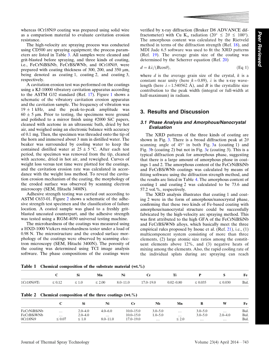 XRD分析表明涂层1和涂层2呈非晶/纳米晶相形式,证实这两种具有非晶/纳米晶体结构的铁基涂层可以通过高速电弧喷涂方法成功制造。 这首先归因于FeCrNiBSiNb和FeCrBSiWNb合金的高GFA,它们基本满足Inoue等人提出的三个经验规则。 (参考文献。21),即(1)由三个以上元素组成的多组分体系,(2)大于12%的构成元素中的大原子比率,以及(3)元素间的混合负热。 而且,电弧喷涂过程中各个钢片的快速冷却速度可以达到