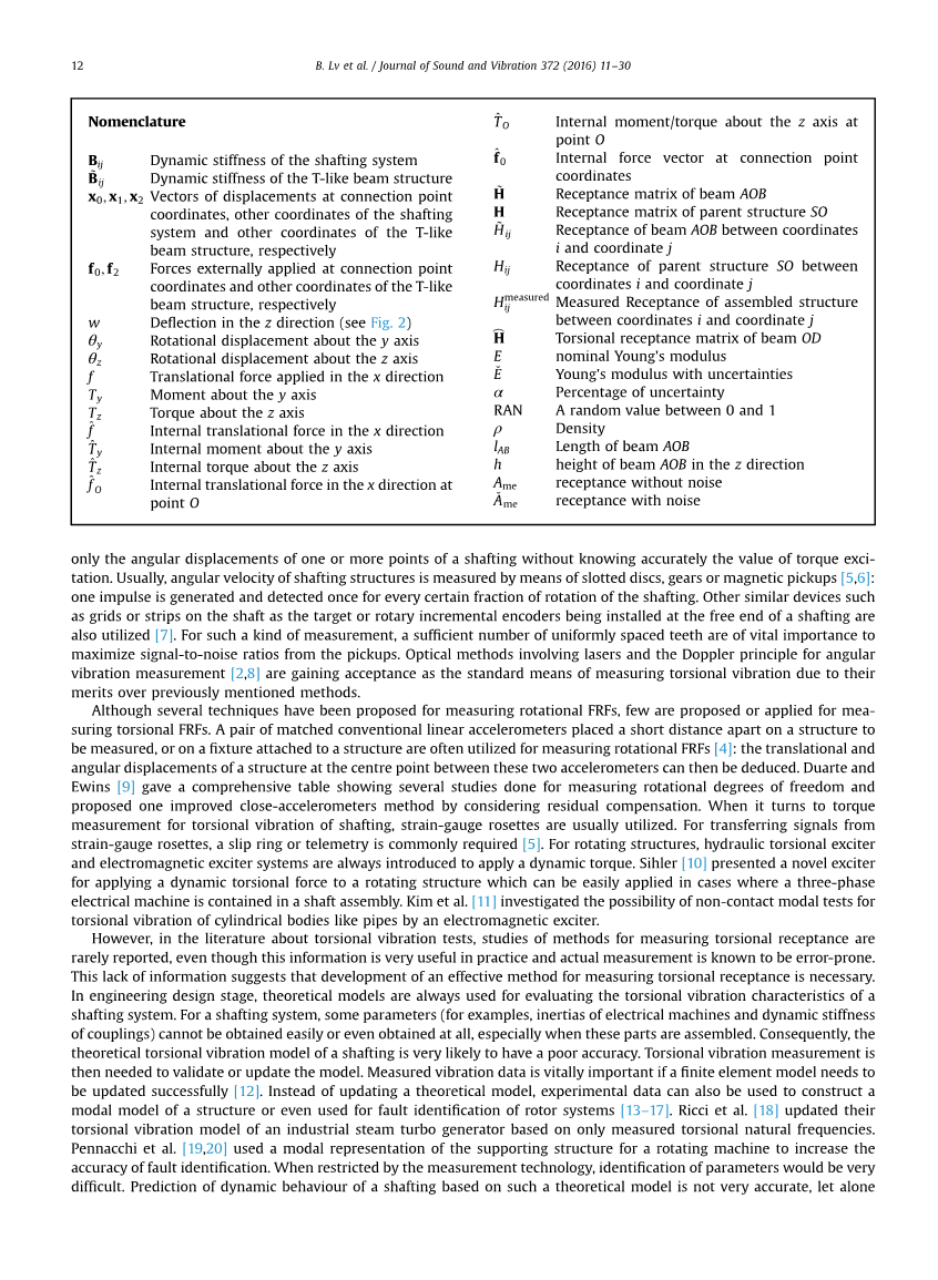 Shafts are common mechanical components that transmit mechanical power and withstand torques. In most cases, the torque a shaft bears would have a fluctuating component. When the frequency of this fluctuation is close to any torsional natural frequencies of the shaft, even a small torque can excite torsional resonance of the shaft and considerable damage may be caused to a machine such as fatigue failure, rapid bearing wear, gear hammering, fan belt slippage and often excessive noise problems[1-3]. Although many researchers have tried to measure frequency response function (FRF) data for rotational degrees-of -freedom (DOFs), only limited success has been made[4] and the accuracy of FRF of torsional vibration data is well known to be poor.