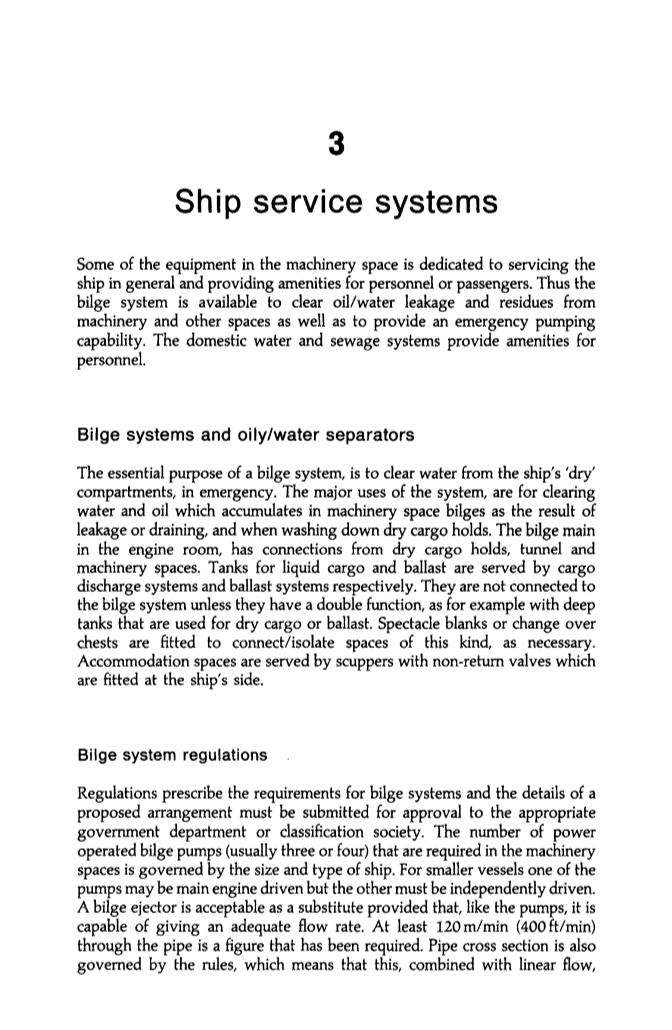 淋浴喷雾,所有水,包括仅用于洗涤的水,应处理消毒。用于淡水的输送软管应进行标记和保存的目的。使用后必须盖住端头,并且必须存放软管避开甲板,以减少污染的风险。国内水箱饮用储罐中的有害生物体已经造成重大的健康问题,对客船和一般船舶人员的健康产生了很大的影响。在石油平台上工作时,为了消除这个问题,储水罐应以六个月的时间间隔抽出,如有必要,可以将表面抽出不应该直接清理他们。在12个月的检查中,重新涂覆是除清洁之外可能需要采取的措施,一般用用50 ppm溶液洗涤。106船舶服务系统当船舶干燥时,建议使用氯,进行超氯化处理,在此期间,包括在四小时内在罐中留下的50ppm氯溶液,然后用清水冲洗。钢罐表面可以准备通过钢丝刷涂和随后起动施加水泥洗涤剂或环氧树脂或其它涂层适用于淡水水箱。