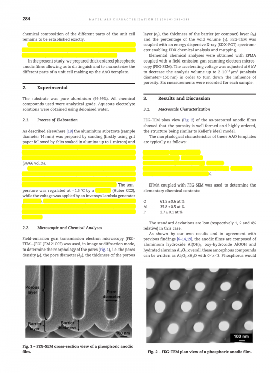 为了制造纳米多孔铝表面(图1a),将电抛光的样品浸没在0.3M草酸(C2H2O4)溶液中,将其置于双壁玻璃烧杯中,在7℃下使用DC电源在45V阳极氧化处理15分钟。 供应(Genesys300鈭 TDK-Lambda,NJ,USA)。铝箔用作工作电极(阳极),并且铂箔用作阳极氧化工艺中的辅助电极(阴极)。 两个电极在距离5厘米处分开。 在电化学过程中,使用磁力搅拌器以150rpm搅拌溶液,以帮助保持样品表面上的恒定温度和均匀的阳极氧化。 在阳极氧化过程之后,将每个样品在乙醇中保持10分钟并在去离子水中小心冲洗以除去电解质溶液的残余物。制作纳米带铝表面(图1c),将纳米多孔表面样品蚀刻成5%wt。磷酸(H3PO4)在30°C下调节一段时间。而且相对较短蚀刻周期(例如,高达约50分钟)仍然导致2D纳米多孔表面在孔隙处理过程中具有增大的孔径(图1b),细长的蚀刻在图1中变薄。将阳极氧化铝(AAO)的纳米多孔结构转变为纳米柱结构的制造过程示意图:(a)初始纳米多孔AAO模式。 (b)通过扩孔(后处理)工艺扩大孔径的纳米多孔AAO图案。 (c)具有进一步蚀刻的NanopillarAAO图案,导致形成断开的单个柱状纳米结构。 (d)具有蒸发干燥的纳米柱AAO图案,导致各个柱结构的聚集,并因此由于毛细管力而形成簇状柱(或锥形)结构。ACS应用材料和界面研究Articl孔壁并最终离开个体(支柱