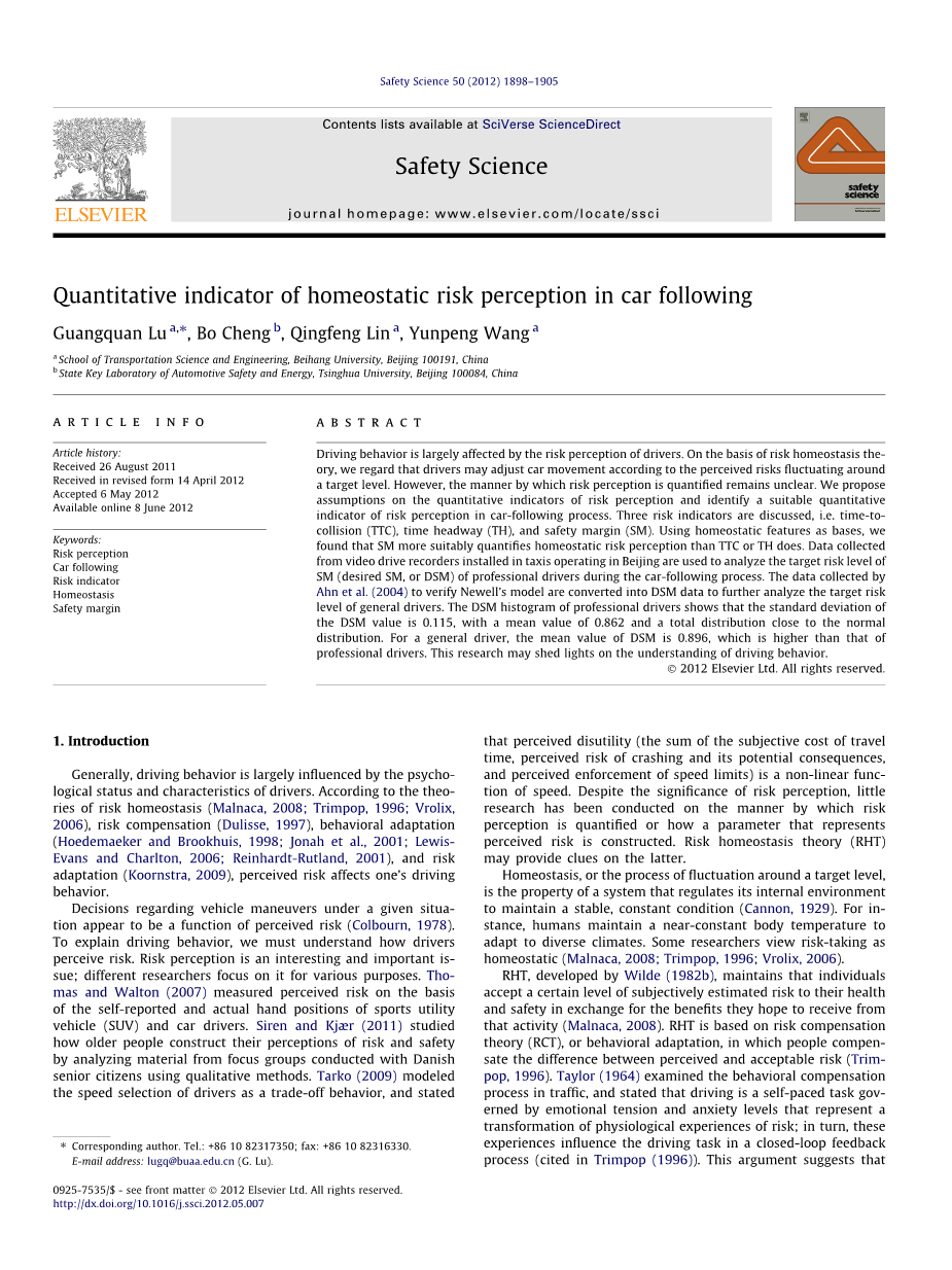Generally, driving behavior is largely influenced by the psycho-logical status and characteristics of drivers. According to the theories of risk homeostasis (Malnaca, 2008; Trimpop, 1996; Vrolix, 2006), risk compensation (Dulisse, 1997), behavioral adaptation (Hoedemaeker and Brookhuis, 1998; Jonah et al., 2001; Lewis-Evans and Charlton, 2006; Reinhardt-Rutland, 2001), and risk adaptation (Koornstra, 2009), perceived risk affects onersquo;s driving behavior.