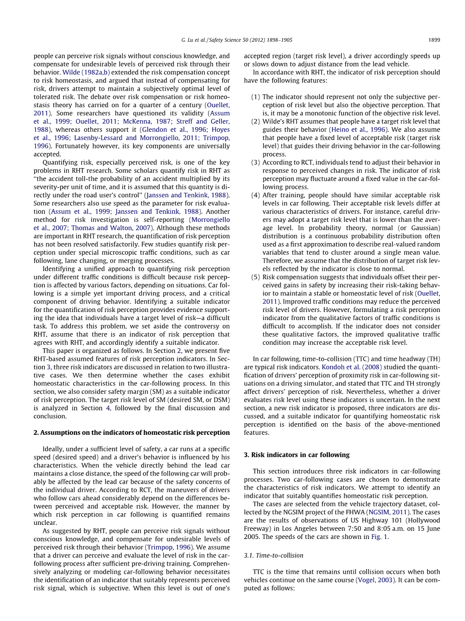 Decisions regarding vehicle maneuvers under a given situation appear to be a function of perceived risk (Colbourn, 1978). To explain driving behavior, we must understand how drivers perceive risk. Risk perception is an interesting and important is-sue; different researchers focus on it for various purposes. Thomas and Walton (2007) measured perceived risk on the basis of the self-reported and actual hand positions of sports utility vehicle (SUV) and car drivers. Siren and Kjaelig;r (2011) studied how older people construct their perceptions of risk and safety by analyzing material from focus groups conducted with Danish senior citizens using qualitative methods. Tarko (2009) modeled the speed selection of drivers as a trade-off behavior, and stated that perceived disutility (the sum of the subjective cost of travel time, perceived risk of crashing and its potential consequences, and perceived enforcement of speed limits) is a non-linear function of speed. Despite the significance of risk perception, little research has been conducted on the manner by which risk perception is quantified or how a parameter that represents perceived risk is constructed. Risk homeostasis theory (RHT) may provide clues on the latter.