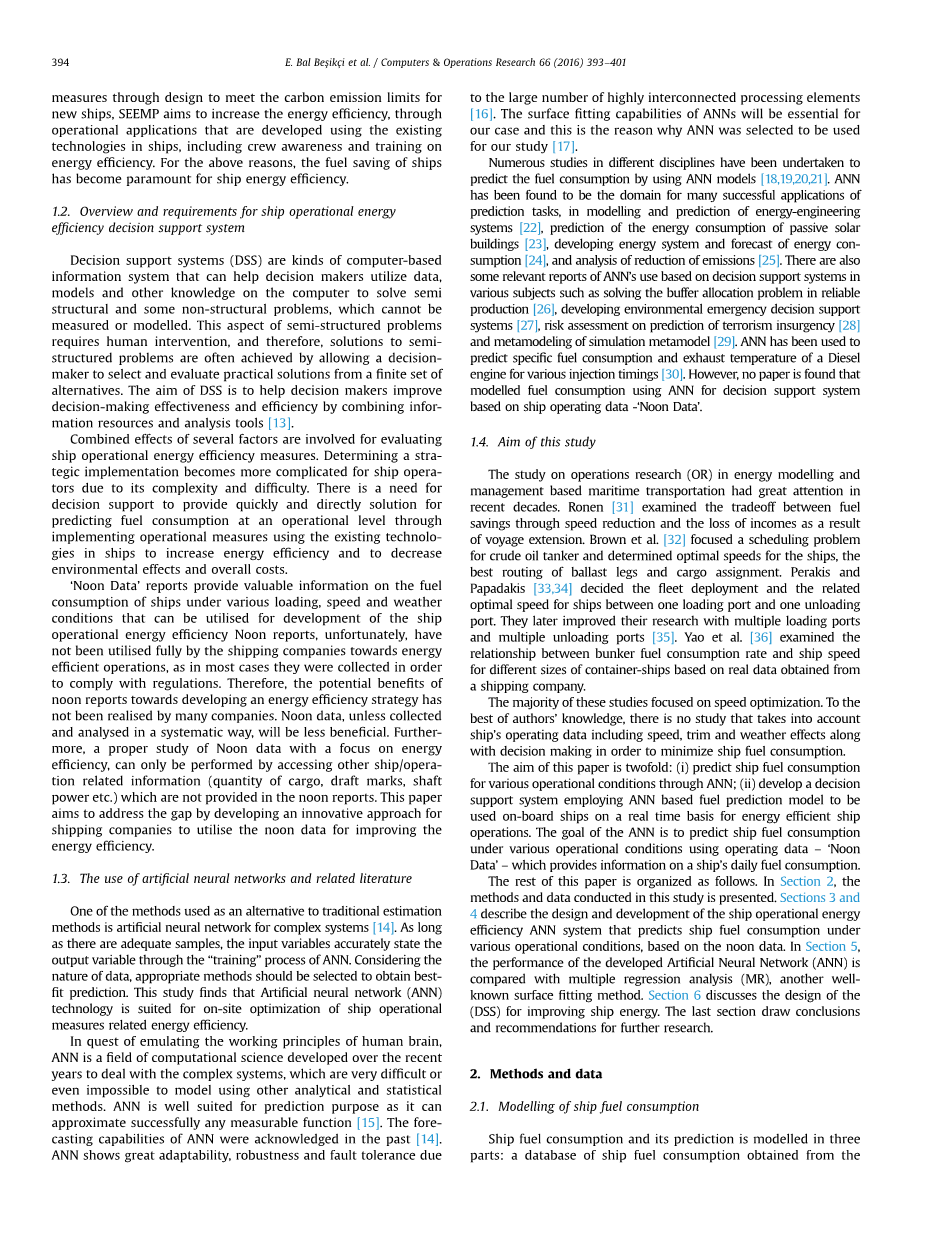 本文的其余部分安排如下。在第2节中,介绍了本研究中进行的方法和数据。第3和第4节介绍了船舶运行能效ANN系统的设计和开发,该系统基于正午数据预测各种运行条件下的船舶燃料消耗。在第5节中,将开发的人工神经网络(ANN)的性能与另一种众所周知的表面拟合方法多元回归分析(MR)进行了比较。第6节讨论了提高船舶能源的(DSS)设计。最后一部分为进一步研究得出结论和建议。