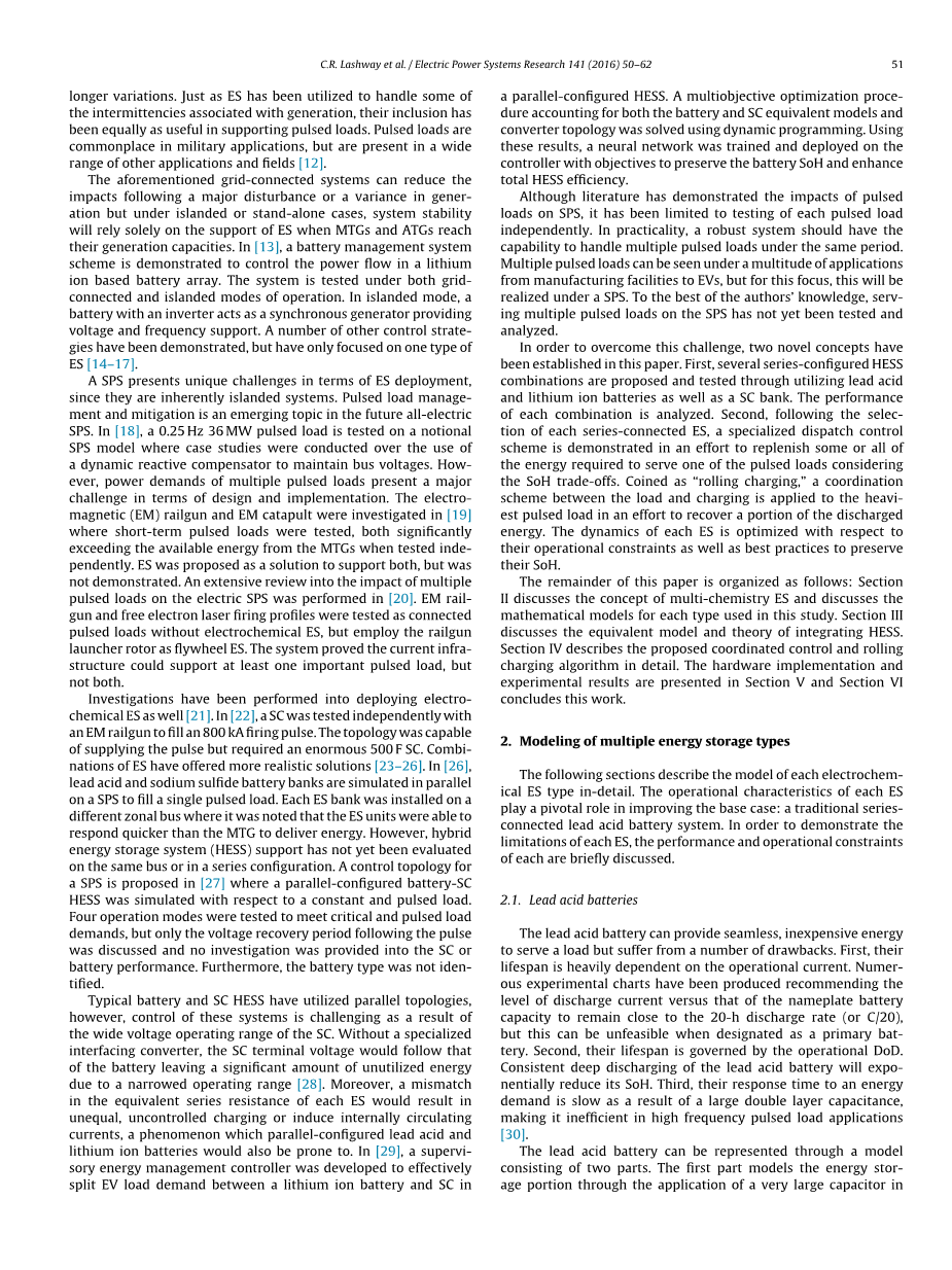 为了克服这一挑战,本文提出了两个新的概念。首先,利用铅酸和锂离子电池以及SC库,提出并测试了几种串联配置的HESS组合。分析了各组合的性能。其次,在每个串联ES的选择之后,一个专门的调度控制方案被演示,以努力补充部分或全部的能量,以服务一个考虑SoH权衡的脉冲负载。称为“滚动充电”,负荷和充电之间的协调方案应用于最沉重的脉冲负载,以努力恢复部分放电能量。每个ES的动态都根据它们的操作约束和最佳实践进行了优化,以保持它们的SoH。