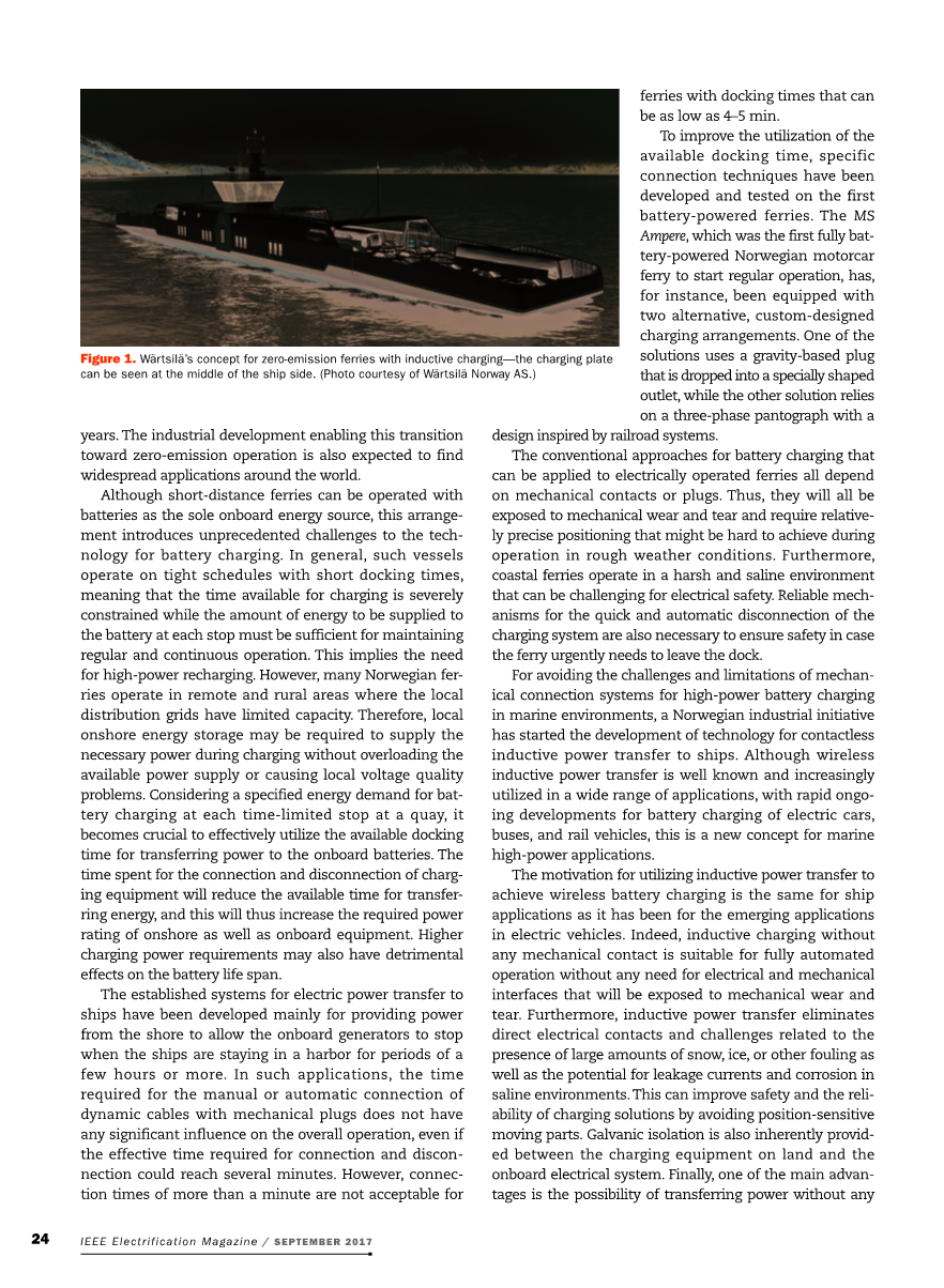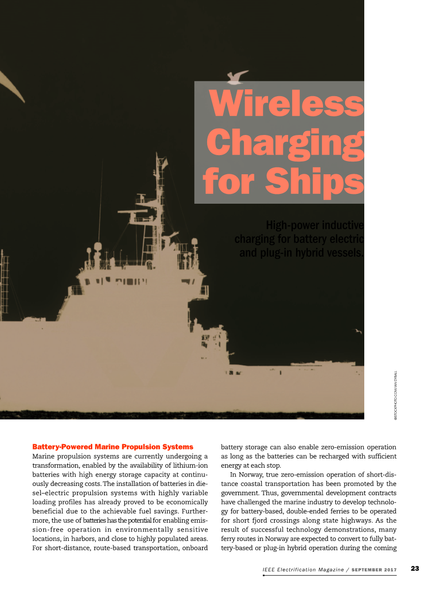 为了避免在海洋环境中进行大功率电池充电的机械连接系统的挑战和限制,挪威的一项工业计划已经开始开发向船舶传输非接触感应功率的技术。虽然无线感应功率传输是众所周知的,并在越来越广泛的应用中得到利用,随着电动汽车、公共汽车和轨道车辆的电池充电的快速发展,但对于船舶大功率应用这是仍一个新的概念。