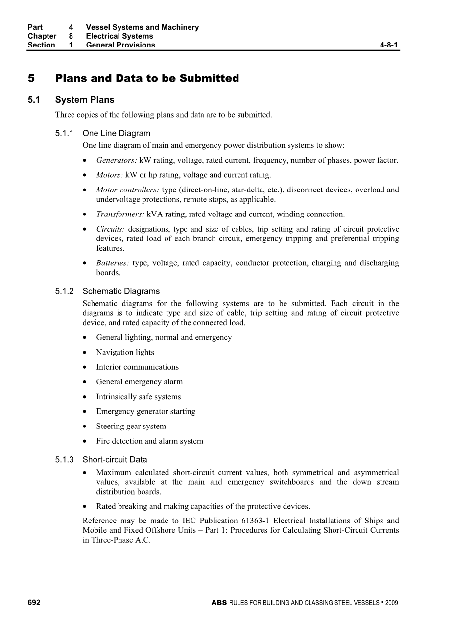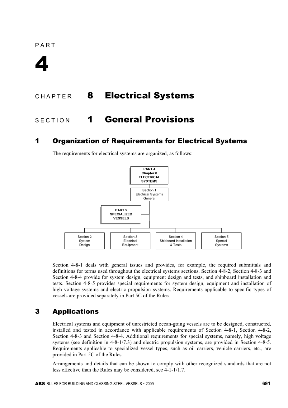 本节规定适用于船舶发电和配电系统。高压系统和电力推进系统应额外遵守第4-8-5节的规定。对于直流系统,除本节和4-8-5/7中明确规定外,请参阅IEC出版物60092-201、60092-202和60092-301。