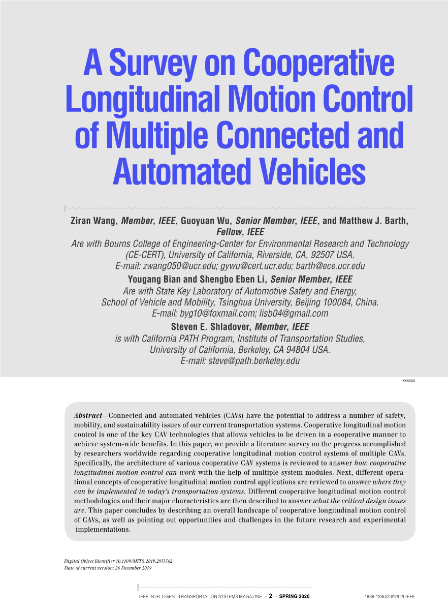 Yougang Bian,Shengbo Eben Li,IEEE高级会员 中国北京清华大学车辆与移动学院,汽车安全与能源国家重点实验室,邮编100084。电子邮件:byg10@foxmail.com;lisb04@gmail.com