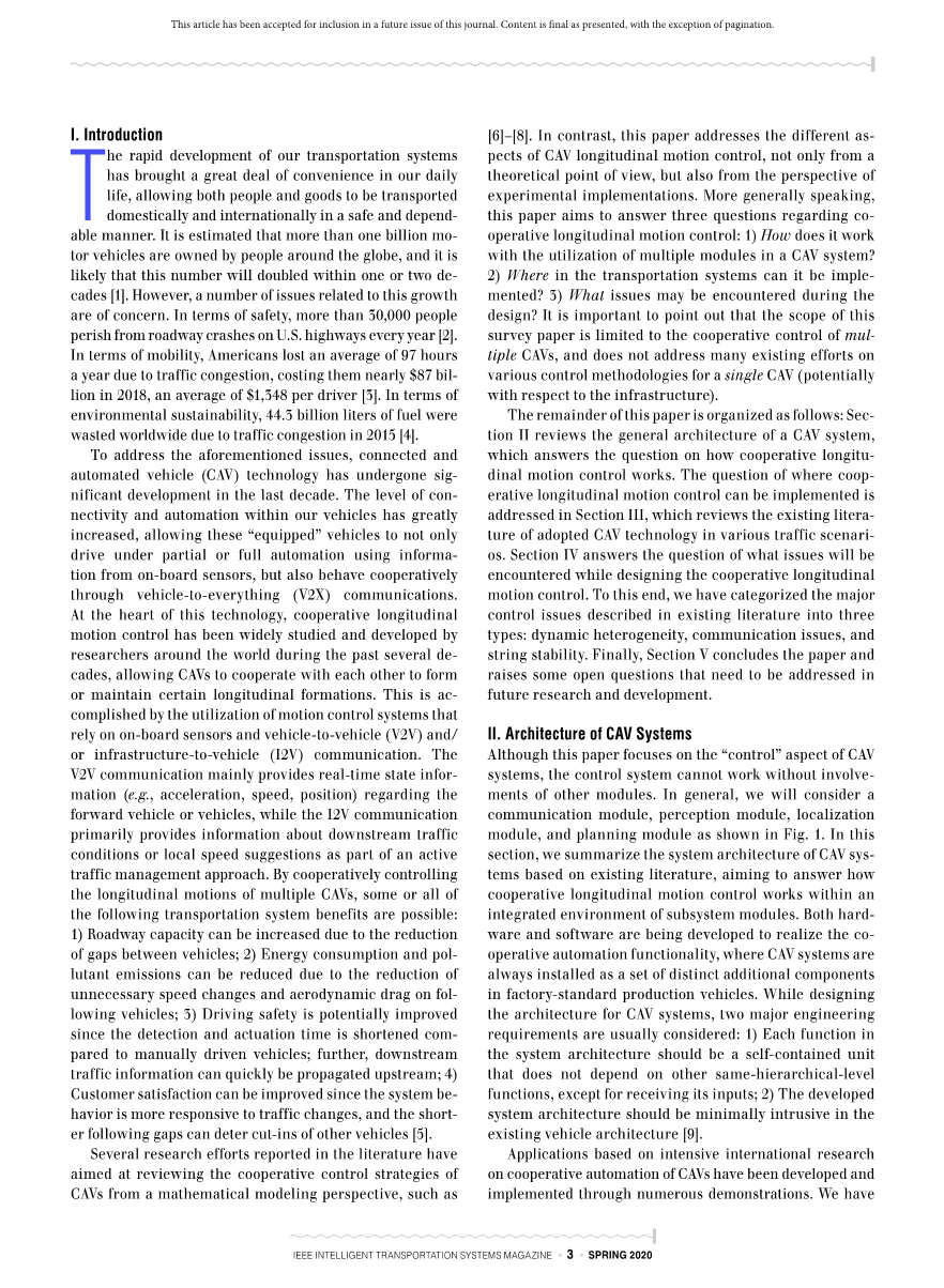 文献报道的几项研究工作旨在从数学建模的角度,如[6]-[8],来回顾网联自动车(CAVs)的协同控制策略。与此不同,本文不仅从理论角度,而且从实践的角度,论述了CAV纵向运动控制的不同方面。更通常地说,本文旨在回答关于协同式纵向运动控制的三个问题: