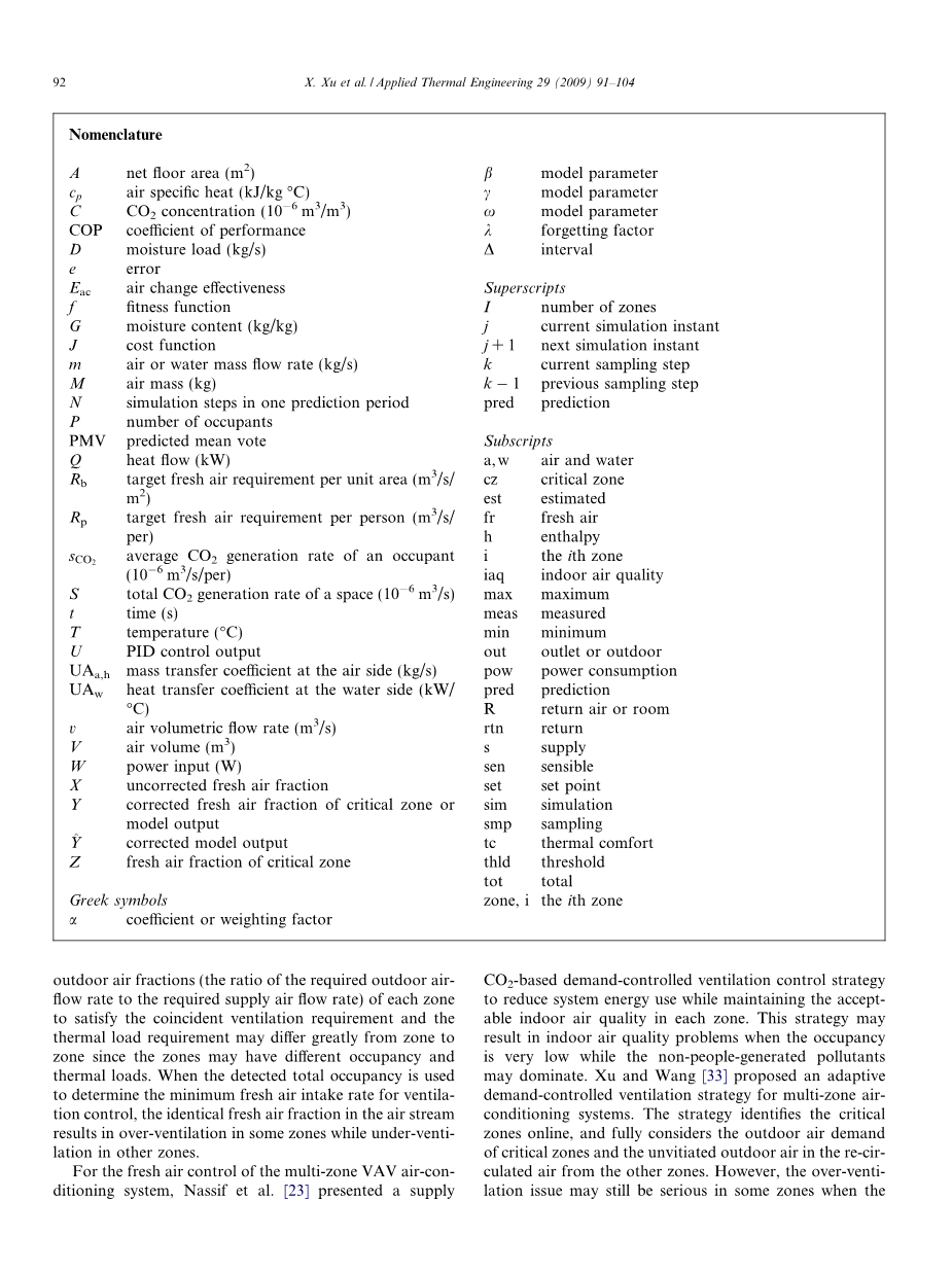 暖通空调领域的最优控制策略受到了广泛的关注[29,31,35,26],控制优化问题(控制点的优化)的关键点在于预测系统响应,并根据系统响应采用合适的优化算法探究最优设置点。为了预测系统响应,以下有三种方案,第一种基于详细的物理模型模拟建筑及暖通空调系统对控制变量变化的响应[18,21];第二个方案基于黑盒模型或神经网络模型预测最优控制响应[11,1];第三种方案利用动态简化模型识别模型参数并进行系统响应预测[29],这是最有利的方法。在该方案中,通过合理简化模型以及自我校正技术,利用实际在线测量结果可以逐步减少错误[7]。基于在线参数识别的动态简化模型[29],在实际控制策略中,一种用于优化空气处理单元供气温度设定值的监督控制策略得到了发展,同时对供给冷水温度与室外通风率进行设置,然而,本文并没有考虑多区域空调系统中不同区域间存在的新风需求不平衡现象。