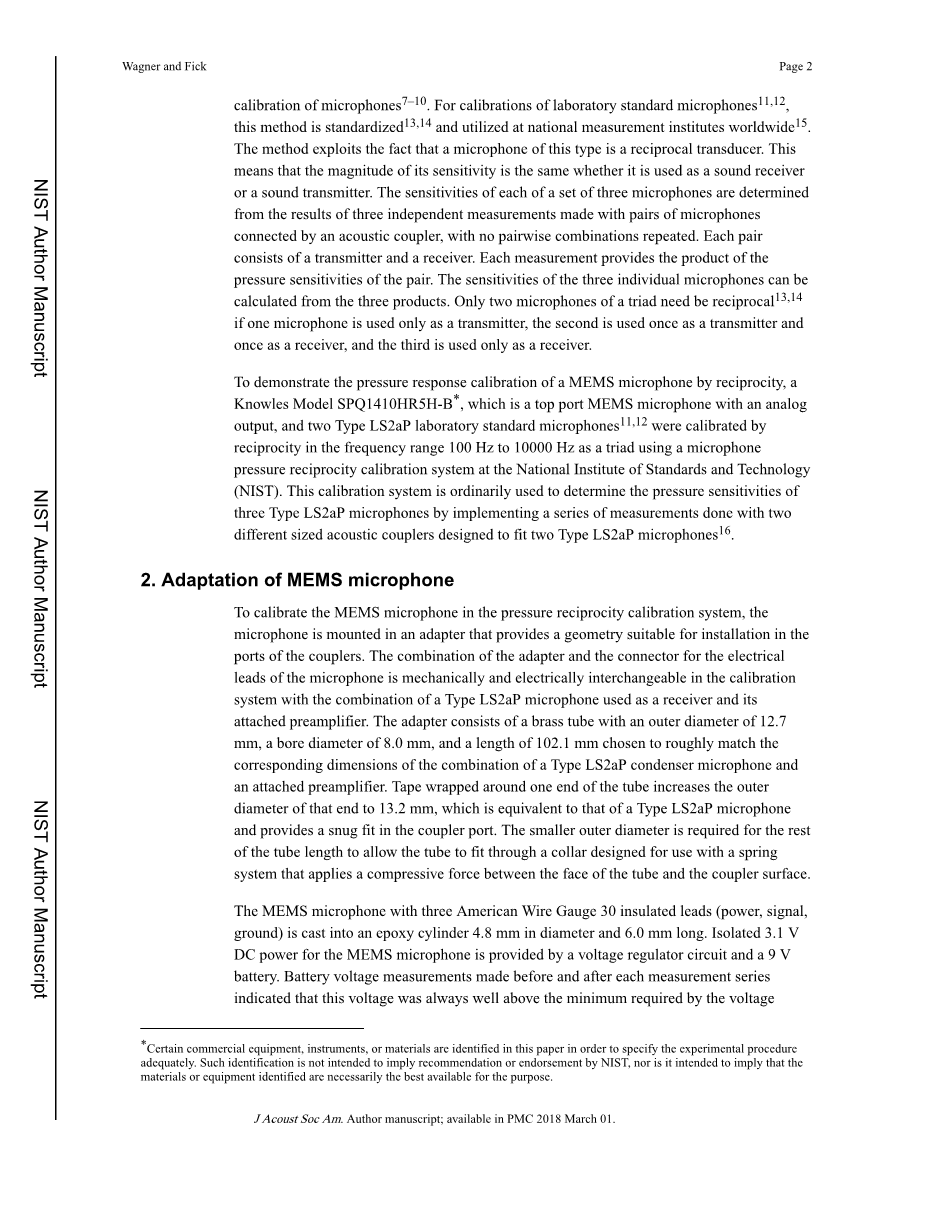为了证明MEMS麦克风的压力响应校正是通过互易进行的,Knowles模型SPQ1410H R5H-B*是一个带有模拟输出的顶部端口MEMS麦克风,两个LS2aP型实验室标准麦克风采用频率范围100Hz至10000Hz的互易校正,作为一个三联体,在国家标准和技术研究所(NIST)使用麦克风压力互易校正系统。该校正系统通常用于确定三种LS2aP型麦克风的压力灵敏度,方法是用两种不同尺寸的声耦合器进行一系列测量,以适应两种LS2aP型麦克风。