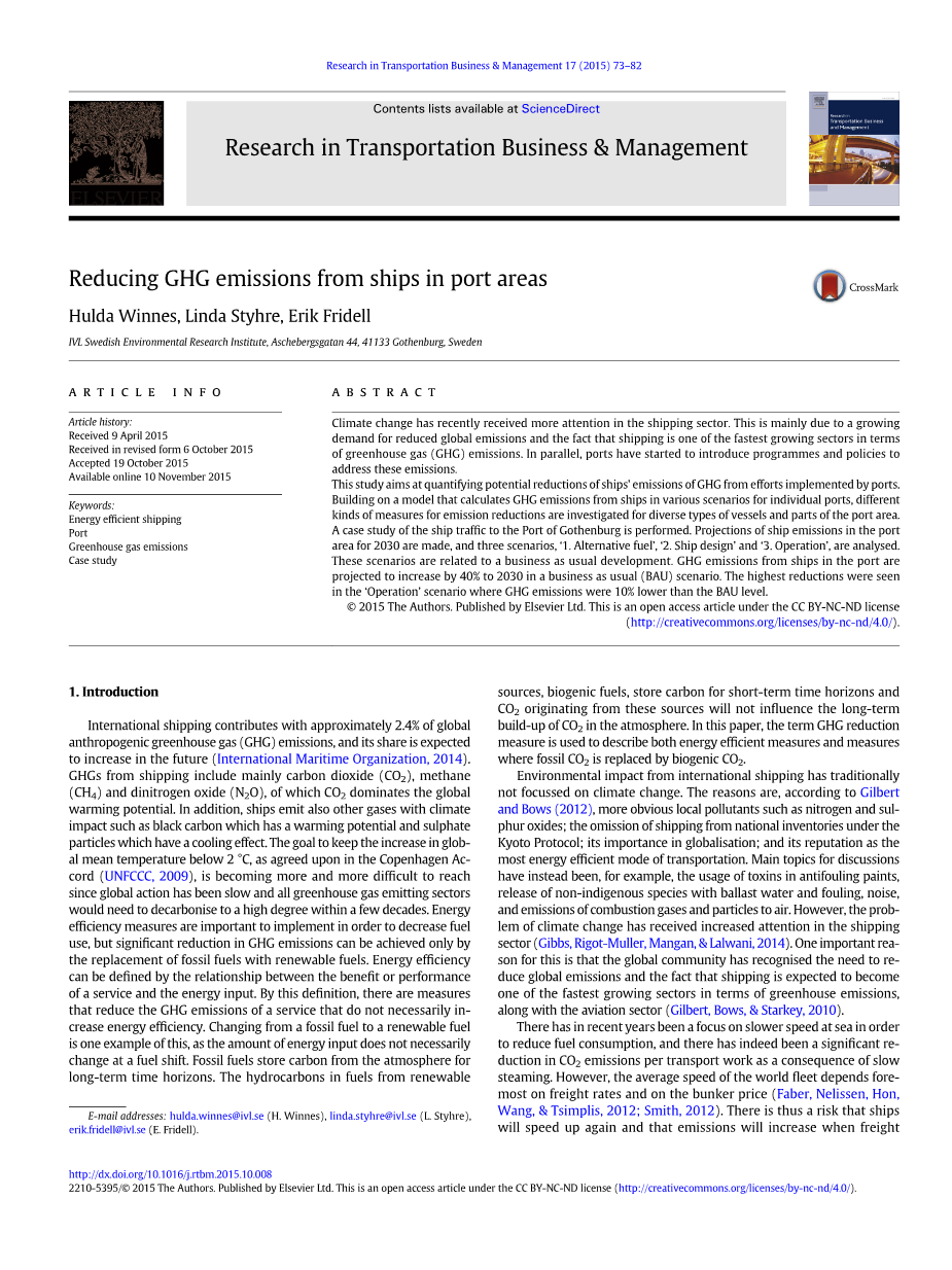 摘要:气候变化最近在航运部门受到更多关注。这主要是由于对减少全球排放的需求日益增长,以及航运是温室气体(GHG)排放量增长最快的部门之一。与此同时,港口已开始引入解决这些排放的方案和政策。这项研究旨在量化港口实施的努力可能减少的GHG船舶排放。在一个模型的基础上,计算了各港口在不同情况下船舶的GHG排放量,针对不同类型的船舶和港口地区的部分地区调查了不同种类的减排措施。对船舶向哥德堡港的运输进行了案例研究。对2030年港区船舶排放进行了预测,提出并分析了三种情景,1:替代燃料;2:改良船舶设计;3:改进操作模式 。这些场景与业务照常发展相关。在“一切照旧(BAU)”的情况下,GHG港口船只的排放量预计到2030年将增加40%。最高的减排效益出现在“运行”情景中,GHG的排放量比BAU低10%。