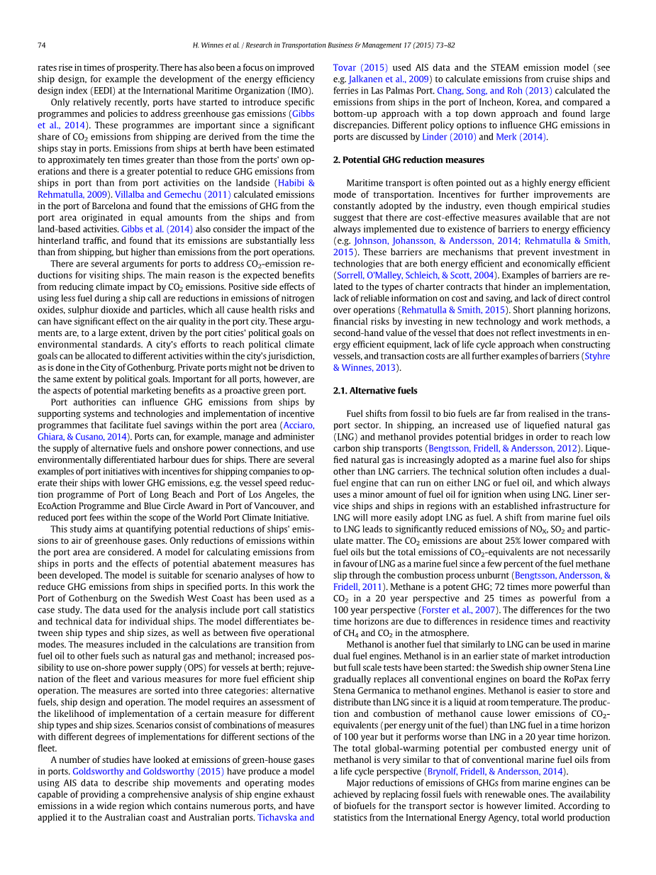 例如Jalkanen等人。计算拉斯帕尔马斯港游船和渡船的排放量。张、宋和卢武铉(2013)计算了韩国仁川港的船舶排放量,并将自下而上的方法和自上而下的方法进行了比较,发现了很大的差异。林德(2010年)和默克(2014年)讨论了影响港口GHG排放的不同政策选择。