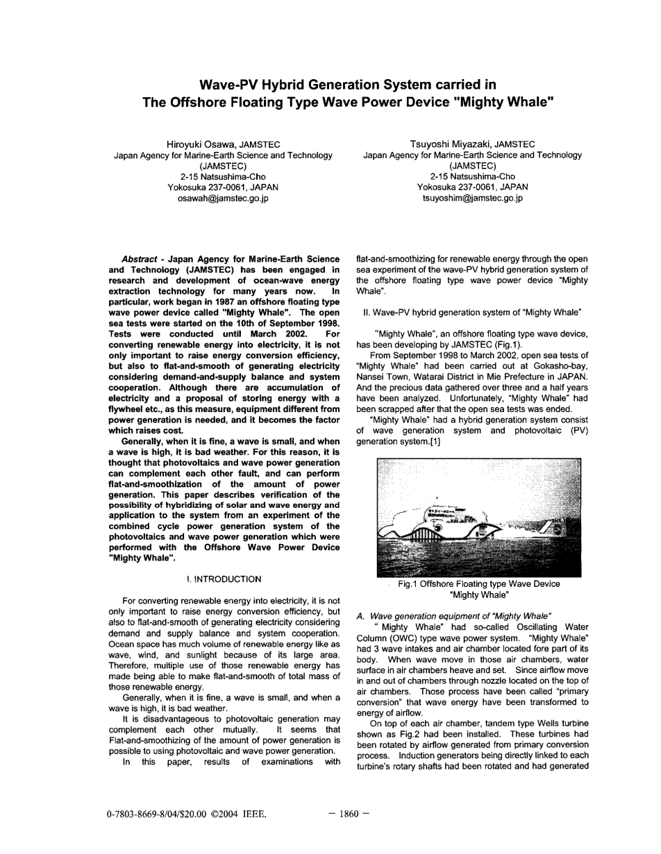 在这篇文章里,主要讲述了通过广阔的海洋将可再生能源运用于在离岸漂浮式的波浪能发电装置“大鲸鱼号”的波浪能发电装置混合发电系统中的一个探索结论。