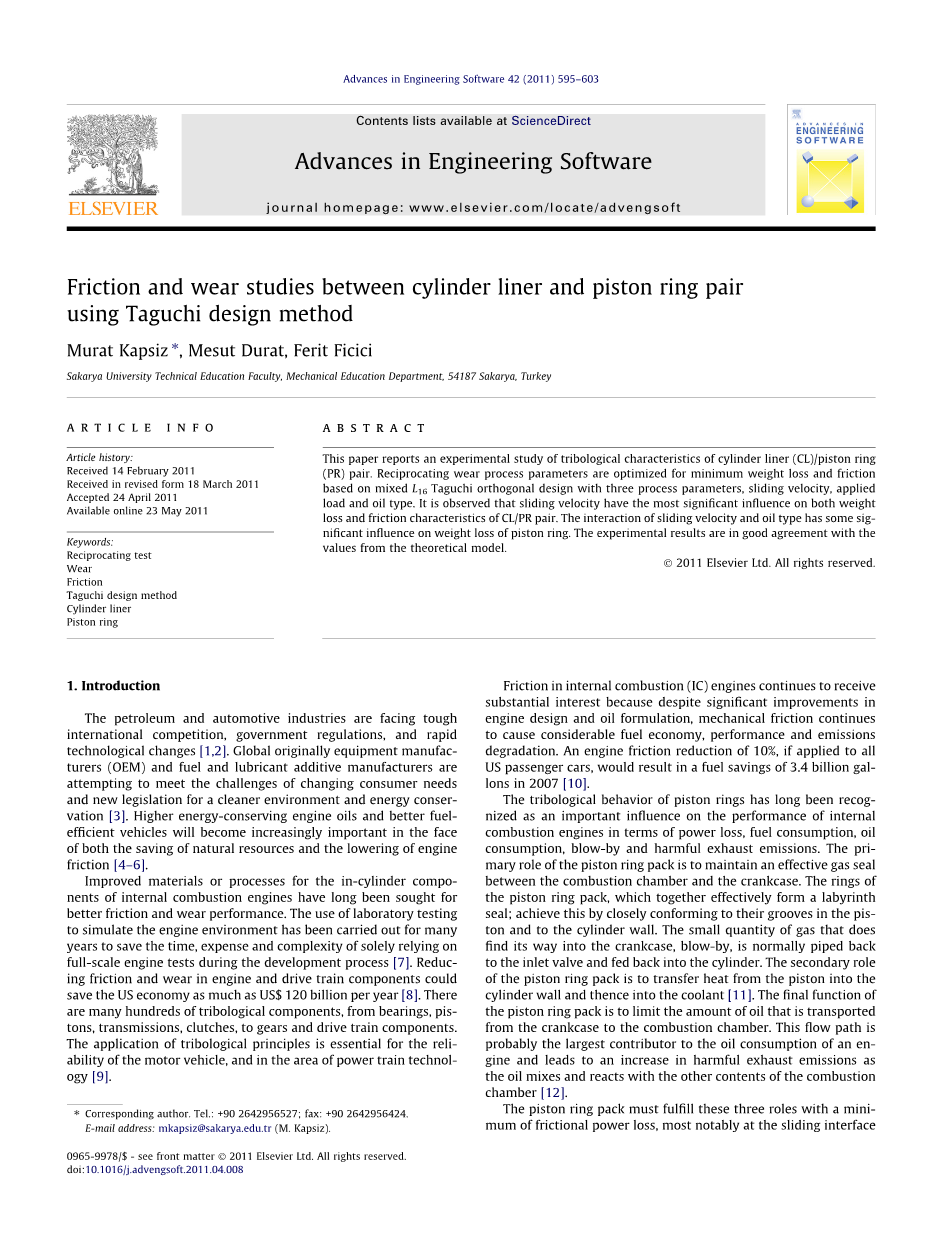 关键字:往复运动测试 摩擦 磨损 Taguchi设计方法 缸套 活塞环