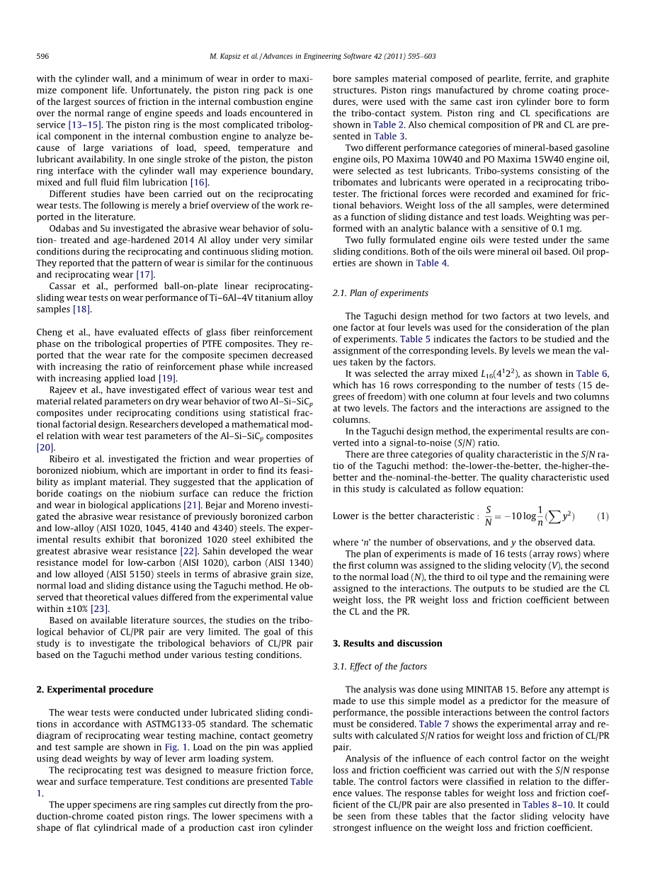 利用Taguchi设计方法研究缸套与活塞环对摩擦磨损