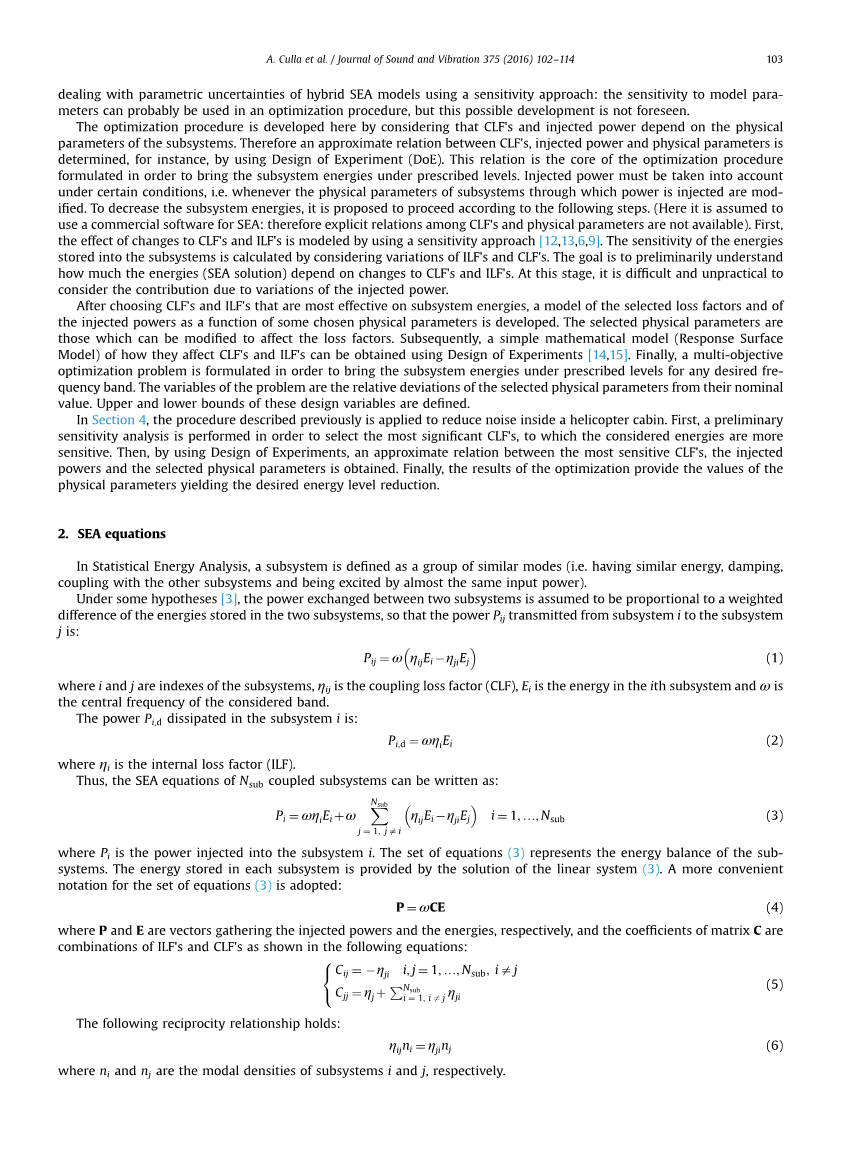 考虑到CLF和注入功率取决于子系统的物理参数,这里开发了优化程序。因此,CLF、注入功率和物理参数之间的近似关系例如通过使用实验设计( DoE )来确定。这种关系是优化程序的核心,制定优化程序是为了使子系统能量低于规定水平。在某些条件下,即每当注入电力的子系统的物理参数被修改时,必须考虑注入的电力。为了降低子系统能量,建议按照以下步骤进行。(这里假设使用商业软件进行se a :因此CLF和物理参数之间没有明确的关系)。首先,通过使用灵敏度方法[ 12,13,6,9 ]来模拟CLF和ILF变化的影响。通过考虑ILF和CLF的变化,计算存储在子系统中的能量的灵敏度。目标是初步了解能量( SEA解决方案)在多大程度上取决于CLF和ILF的变化。在这个阶段,考虑由于注入功率的变化造成的贡献是困难和不切实际的。
