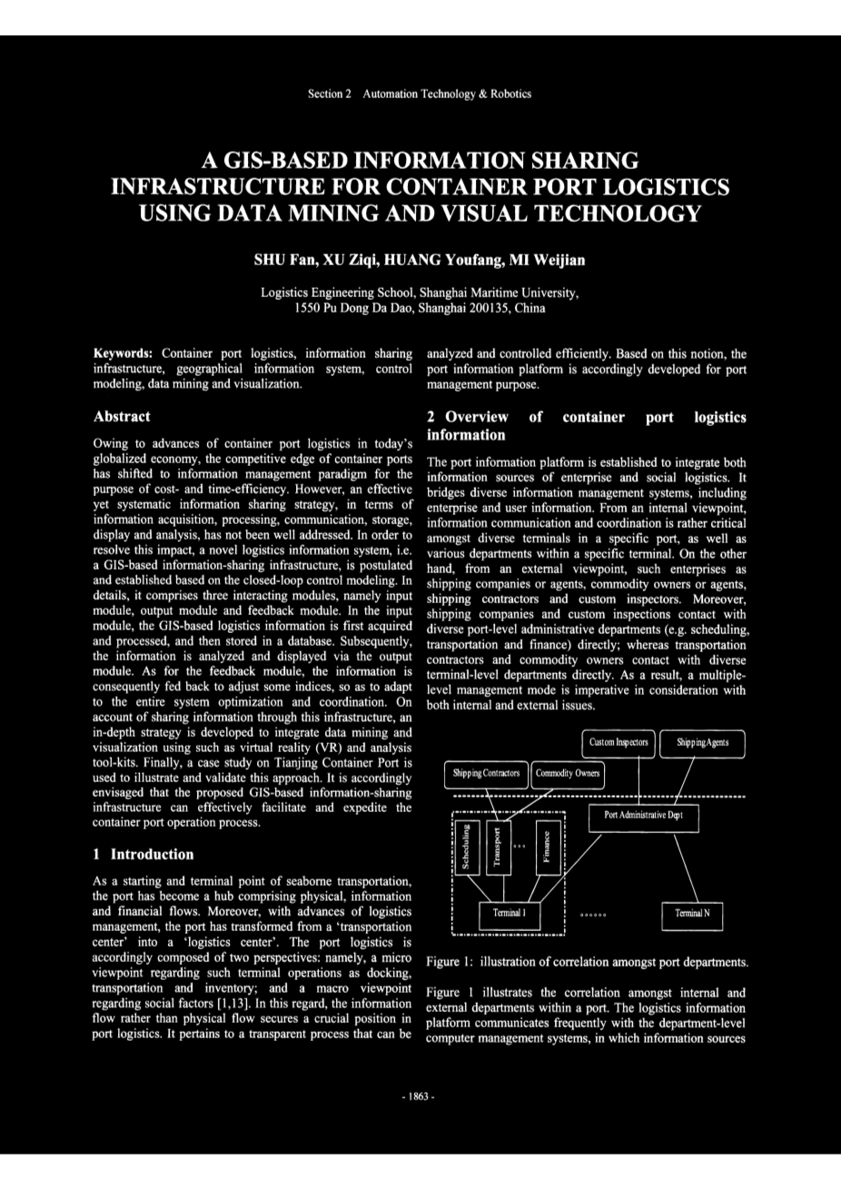 关键词:集装箱港口物流,信息共享基础设施,地理信息系统,控制建模,数据挖掘与可视化。