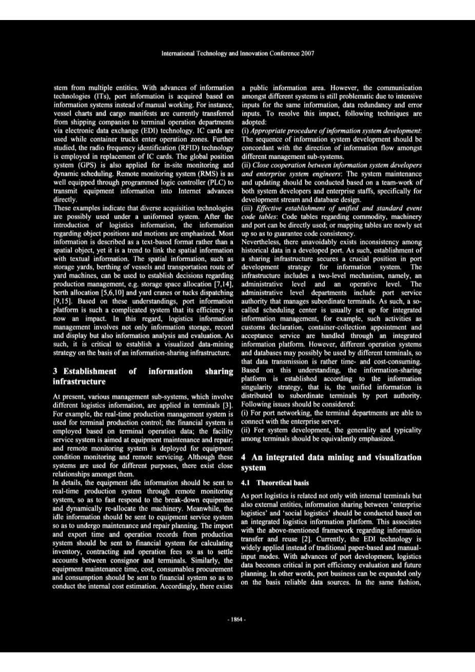 图1显示了港口内部和外部部门之间的相关性。物流信息平台与部门级计算机管理系统进行通信,其中来自多个实体的信息源。随着信息技术(IT)的发展,基于信息系统而不是手工工作获取端口信息。例如,船舶图和货物舱单目前通过电子数据交换(EDI)技术从航运公司转移到码头运营部门.IC卡是当集装箱卡车进入作业区时使用。进一步研究,使用射频识别(RFID)技术来替代IC卡。全球定位系统(GPS)也适用于现场监控和动态调度。远程监控系统(RMS)也通过编程逻辑控制器(PLC)进行配置,直接将设备信息传输到网上。这些例子表明,不同的采集技术可能在统一的系统下使用。介绍物流信息后,强调有关对象位置和动议的信息。大多数信息被描述为基于文本的格式而不是空间对象,但是将空间信息与文本信息进行链接的趋势也是如此。空间信息,如存储场,码头停泊和码头运输路线,可用于制定关于生产管理的决策,例如,存储空间分配,泊位分配和码头起重机或集装箱。基于这些理解,港口信息平台是一个复杂的系统,其效率现在正在受到影响。在这方面,物流信息管理不仅涉及信息存储,记录和显示,还涉及信息分析和评估。因此,在信息共享基础设施的基础上建立可视化数据挖掘战略至关重要。