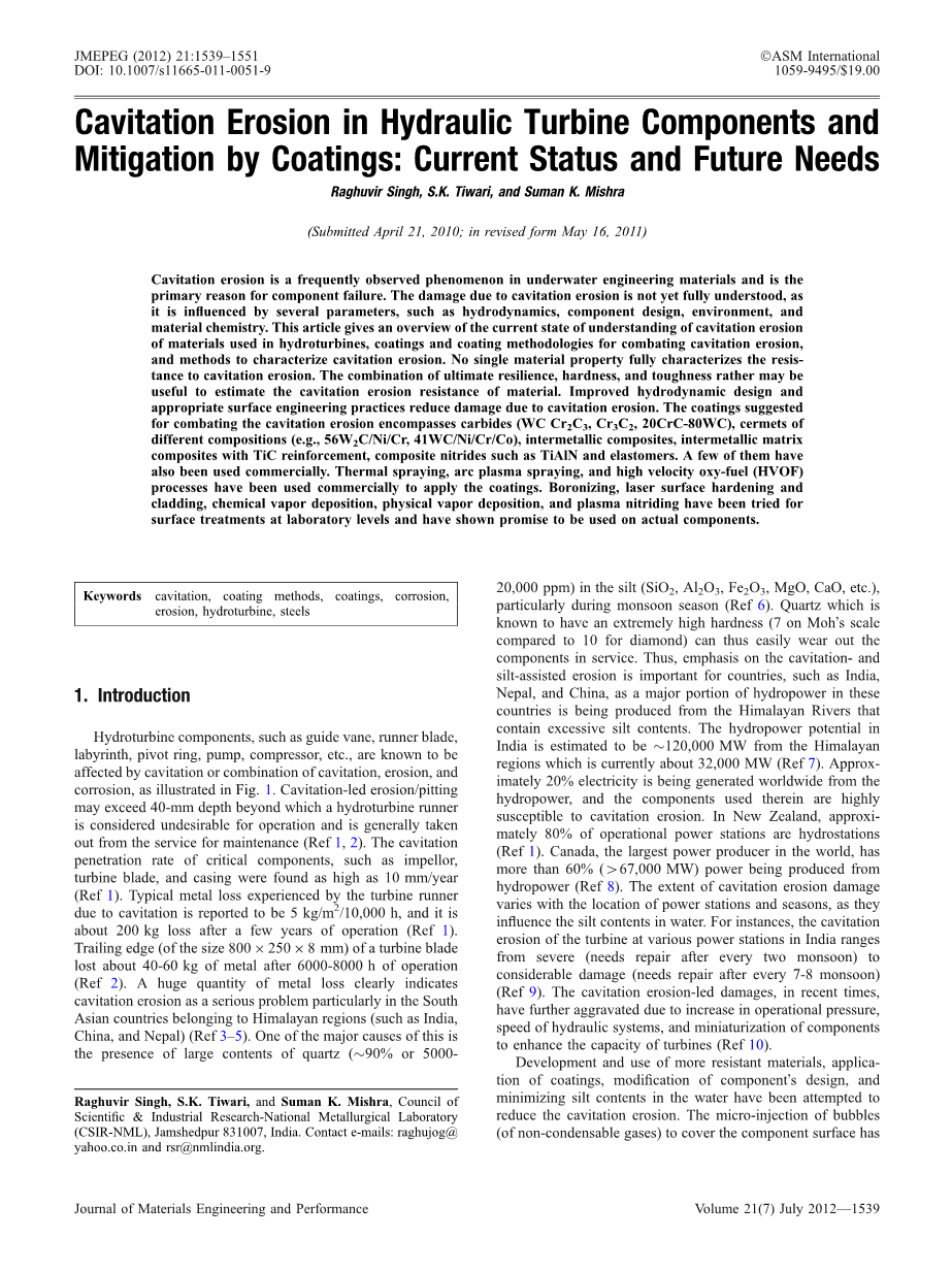 水轮机组件,如导向叶片、转轮叶片、迷宫、枢轴环、泵、压缩机等均已被查明受到了气蚀或气蚀、侵蚀综合性的腐蚀影响,如图1所示。气蚀导致的侵蚀/点蚀可能超过40毫米深度,水轮机操控员认为超过这个值的水轮机是不可再使用的,并且通常应该立即采用维修服务[1,2]。气蚀关键部件的渗透率如叶轮、涡轮叶片和套管被发现高达10毫米/年[1]。涡轮转轮经历由于气蚀而引起的典型金属损失被报道为5公斤/平方米/ 10,000 h,就是经过几年的工作后约200公斤的损失[1]。涡轮叶片的后缘(尺寸为800 9 250 9 8 mm)6000-8000小时后,金属损失约40-60公斤[2]。大量的金属损失清楚地表明气蚀侵蚀是一个严重的问题,特别是在属于喜马拉雅地区的南方亚洲国家(如印度、中国和尼泊尔)[3-5]。其中一个主要原因是存在大量石英(90%或5000-20,000 ppm)在淤泥(SiO 2,Al 2 O 3,Fe 2 O 3,MgO,CaO等)中,特别是在季风季节[6]。石英是已知具有非常高的硬度(与钻石为10相比它为7 Mohs)可以轻易磨损在服务中的组件。因此,重视空化和淤泥侵蚀对于某些国家来说是非常重要的,如印度、尼泊尔和中国,作为以水电为主要部分的这些国家的水电正在从含有过多的淤泥含量喜马拉雅河中生产。印度的水电潜力估计距离喜马拉雅12万兆瓦目前约32,000兆瓦的地区[7]。约来自世界各地的电力已经达到20%水电,其中使用的组件高度容易发生气穴侵蚀。在新西兰,大约80%的运行电站是水力发电站[1]。加拿大是世界上最大的电力生产国超过60%(gt; 67,000兆瓦)的电力生产水电[8]。空蚀侵蚀程度随着电站和季节的不同而不同影响水中的淤泥含量。对于实例,空化印度各个发电厂的涡轮机受到侵蚀从严重(需要每两季季风修复)至相当大的破坏(每7-8季风需要修理)[9]。气蚀侵蚀导致的损害,近期,由于经营压力的增加而进一步恶化,液压系统的速度和小型化气蚀侵蚀导致的损害,以提高涡轮机的容量[10]。