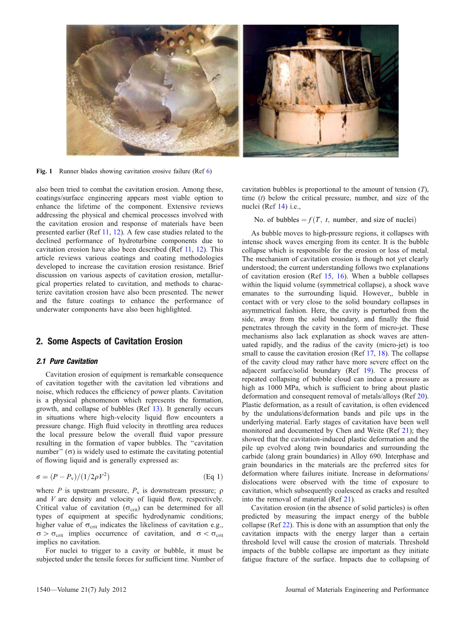目前已经尝试开发和使用更耐用的材料,涂层的应用、部件设计的改进以及使水中的淤泥含量最小化,以减少空化侵蚀。微注射气泡(不可冷凝气体)覆盖部件表面也试图对其产生空蚀。其中,涂层/表面工程似乎是提高部件寿命的最可行的选择。前面提到了涉及空化侵蚀和材料响应的物理和化学过程的广泛评论[11,12]。还有一些关于由于气蚀侵蚀导致的水轮机组件性能下降的案例研究[11,12]。 本文综述了各种涂层和涂层制备方法,以提高其抗气蚀侵蚀性。并对气蚀进行了各个方面简要的讨论,涉及到气蚀和冶金空蚀性能表征方法。新一代和未来的涂料也提升了水下部件的性能也得到了突出表现。