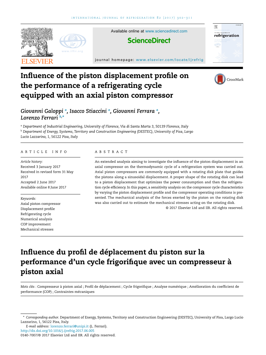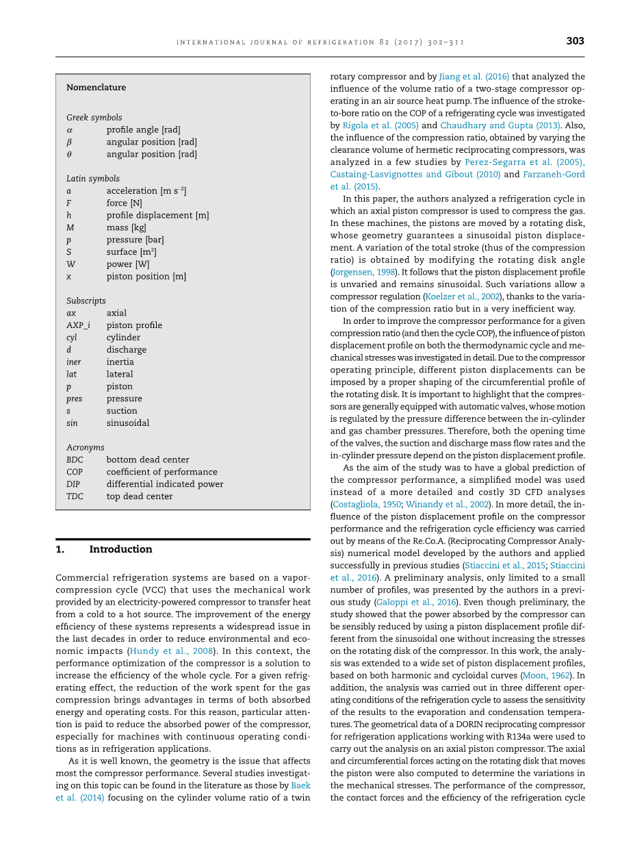 (Costagliola,1950年;Winandy等人,2002年)。更详细地说,活塞排量分布对压缩机性能和制冷循环效率的影响是通过作者开发并成功应用于先前研究(Stiaccini等人,2015年;Stiaccini等人,2016年)的Re.Co.A.(往复压缩机分析)数值模型来实现的。作者在之前的一项研究中提出了一个初步分析,仅限于少量剖面(Galoppi等人,2016)。研究表明,在不增加压缩机旋转盘应力的情况下,采用不同于正弦曲线的活塞位移廓线,可以有效地降低压缩机所吸收的功率。在这项工作中,基于谐波曲线和摆线曲线(Moon,1962),分析扩展到一组广泛的活塞位移分布。此外,为了评估结果对蒸发和冷凝温度的敏感性,在制冷循环的三种不同操作条件下进行了分析。利用制冷用多林往复压缩机的几何数据,对轴流活塞式压缩机进行了分析。还计算了作用在旋转盘上移动活塞的轴向和周向力,以确定机械应力的变化。通过对压缩机性能、接触力和制冷循环效率的COP估算,量化了活塞位移曲线变化带来的优势。