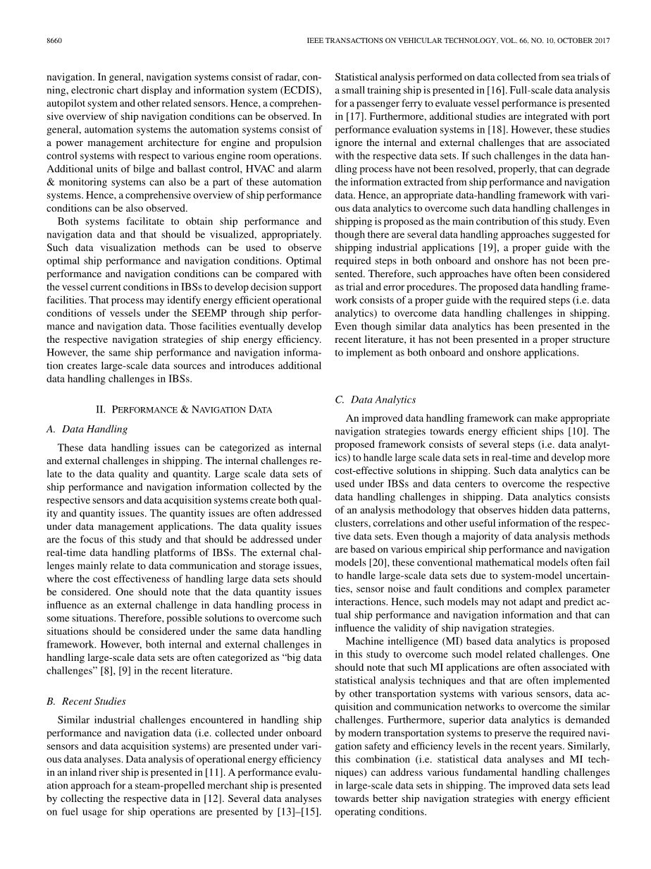 国际海事组织(IMO)和其他各海事局引入了各种排放控制(即二氧化碳、硫氧化物和氮氧化物)法规来提高航行能源效率。此外,各海事部门在指定的排放控制区(ECAs)内对于船舶实施了更严格的排放控制措施。[7]。这些现行排放控制法规在船舶能源效率管理计划(SEEMP)下实行了大量能效措施。因此,SEEMP可以促进制定适当的航行策略,以适应这种作为现代IBSs一部分的基于排放控制的能效措施。应根据IBSS收集足够的船舶性能和航行数据以开发此类船舶航行策略。此外,有效的航行策略是基于从数据集中提取的船舶性能和航行信息的质量。我们应该注意的是,数据处理过程经常影响船舶性能和航行数据的质量。所需的传感器和数据采集系统(DAQs)有助于现代的IBSs支持此类数据处理过程。
