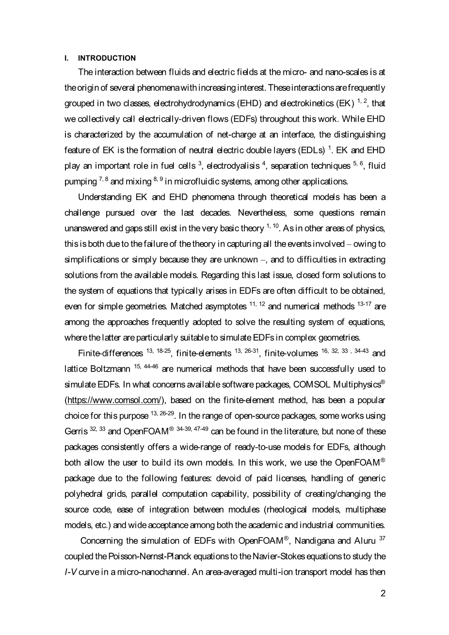 有限差异13,18-25,有限元13,26-31,有限体积16,32,33,34-43和玻尔兹曼网格15,44-46是已经成功应用模拟电驱动流的数据方法。在可用的软件包中,基于有限元方法的一直是很受欢迎的选择。 在开源软件包的范围内,一些使用可以在文献中找到的Gerris32,33和OpenFOAM34-39,47-49,但这些软件包中没有一个能够始终如一地为EDF提供各种即用型模型,尽管两者都允许用户构建自己的模型。在这项工作中,我们使用OpenFOAM安装包由于以下特点:缺乏付费许可,处理通用多面体网格,并行计算能力,创建/改变源代码的可能性,模块之间易于集成(流变模型,多相模型等)并得到学术界和工业界的广泛认可。