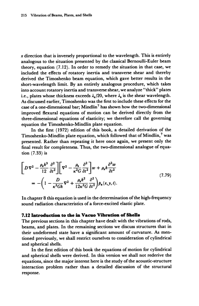 x的方向与波长成反比。这完全类似于经典的伯努利-欧拉梁理论方程(7.12)所呈现的情况。为了纠正这种情况,我们将旋转惯性和横向剪切的影响包括在内,从而推导出铁木辛柯梁(Timoshenko)运动方程,这在短波长的限制中得到了更好的结果。通过考虑旋转惯性和横向剪切的完全类似的程序,我们分析“厚”板,即厚度超过/20的板,其中是剪切波长。如前所述,铁木辛柯梁(Timoshenko)是第一个将这些影响包含在一维杆中的人; Mindlin7展示了如何直接从三维弹性方程推导出二维改进的运动弯曲方程;因此,我们将控制方程称为Timoshenko-Mindlin板方程。在本书1972出版的第一个版本中,详细推导了Timoshenko-Mindlin板块方程,该方程式遵循Mindlin7。我们不再在此再次重复,而是仅提供完整性的最终结果。因此,二维模拟的等式(7.33)是