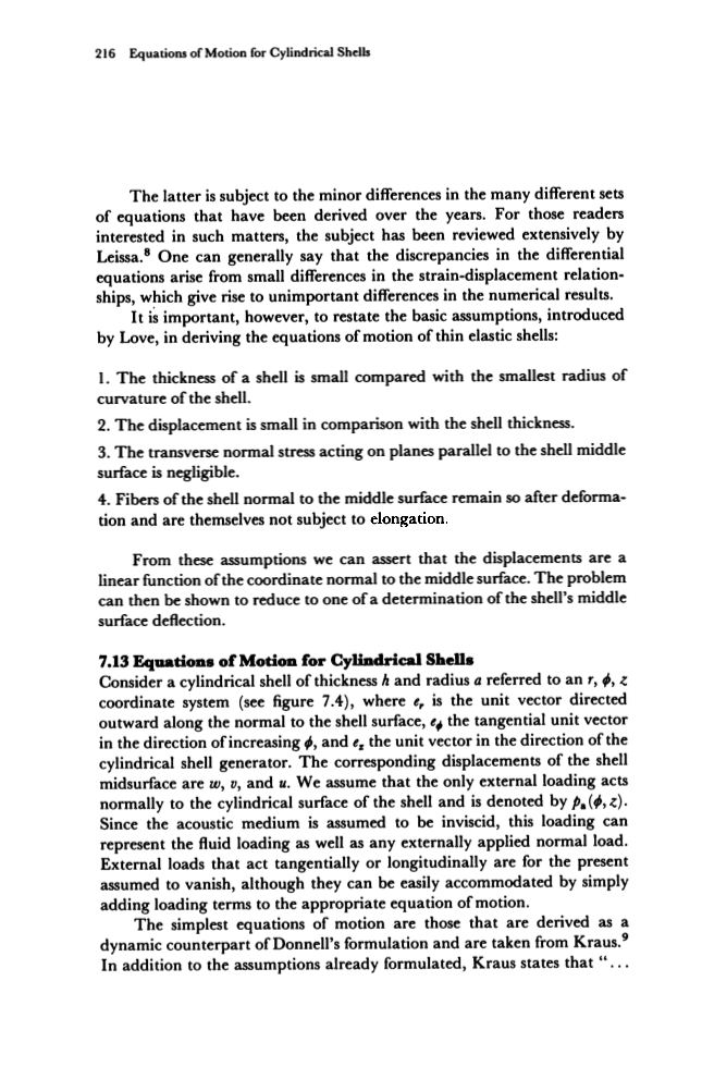 后者受到推导出的许多不同方程组的微小差异的影响已经很多年。对于那些对这些问题感兴趣的读者,Leissa已经对该主题进行了广泛的审查。人们通常可以说微分方程中的差异来自于应变-位移关系的微小差异,从而导致了不重要的数值结果差异。然而,重要的是重述Love所引入的基本假设,以推导薄弹性壳的运动方程: