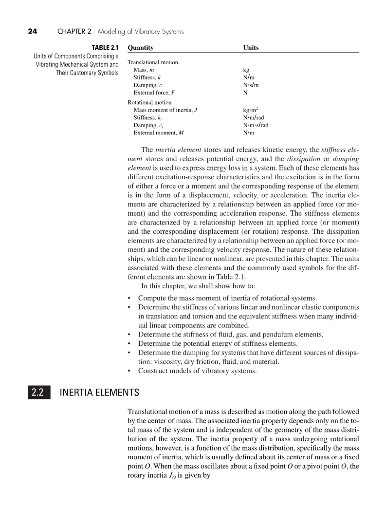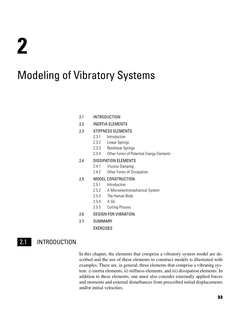 在本章中,描述了构成振动系统模型的元素,并通过示例说明了这些元素用于构建模型的用途。通常存在三个包括振动系统的元件:i)惯性元件,ii)刚度元件,iii)耗散元件。除了这些元素之外,还必须考虑外部施加的力和力矩以及来自规定的初始位移和/或初始速度的外部干扰。