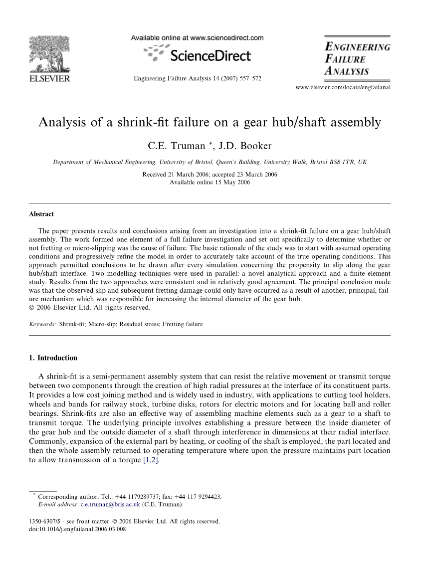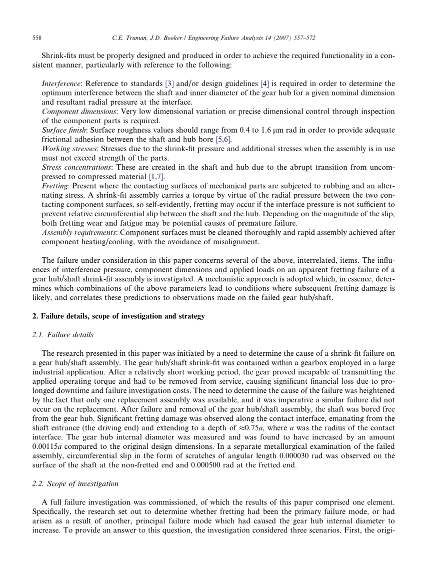 本文的研究是由确定齿轮轮毂/轴总成收缩配合失效原因的需要开始的。齿轮轮毂/轴的收缩配合包含在大型工业应用中使用的齿轮箱中。经过一段相对较短的工作时间后,证明该齿轮无法传递所施加的工作扭矩,因此必须停止使用,并因长期停机和故障调查成本造成重大经济损失。由于只有一个更换组件可用,因此更需要确定故障原因,而且更换时必须没有发生类似的故障。在齿轮轮毂/轴总成发生故障和拆卸后,轴从齿轮轮毂上自由钻孔。沿接触界面观察到显著的微动损伤,从轴入口(驱动端)开始,延伸至asymp;0.75a的深度,其中a是接触界面的半径。测量了齿轮轮毂内径,发现与原始设计尺寸相比增加了0.00115a。在对失效总成的单独冶金检查中,在非磨损端轴表面和磨损端轴表面观察到0.000500 rad角长度为0.000030 rad的划痕形式的周向滑动。