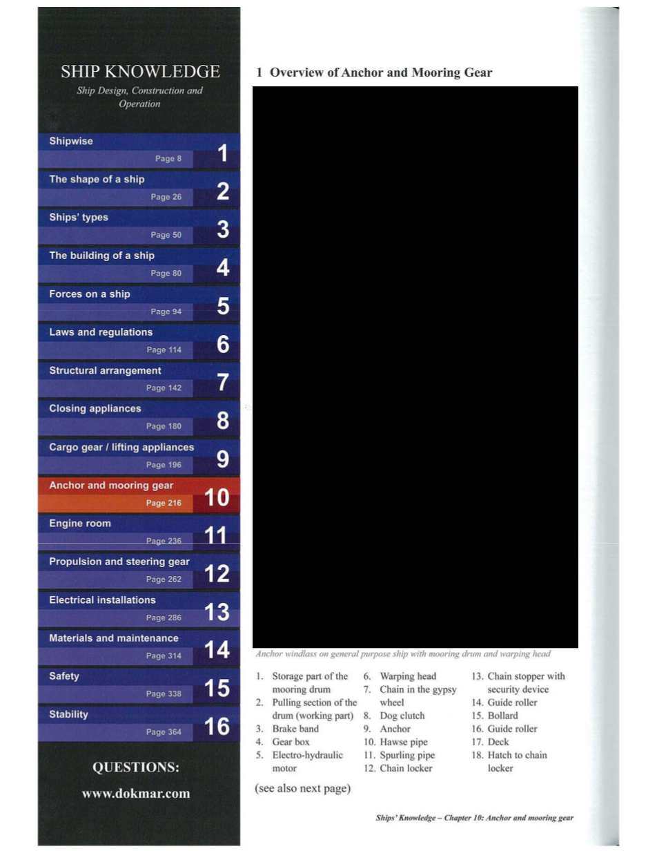 1. Storage part of the mooring drum 2. Pulling section of the drum (working part) 3. Brake band 4. Gear box 5. Electro-hydraulic motor 6. Warping head 7. Chain in the gypsy wheel 8. Dog clutch 9 Anchor 10 Hawse pipe 11. Spurling pipe 12. Chain locker 13. Chain stopper with security device 14. Guide roller 15. Bollard 16. Guide roller 17. Deck 18. Hatch to chain locker |
