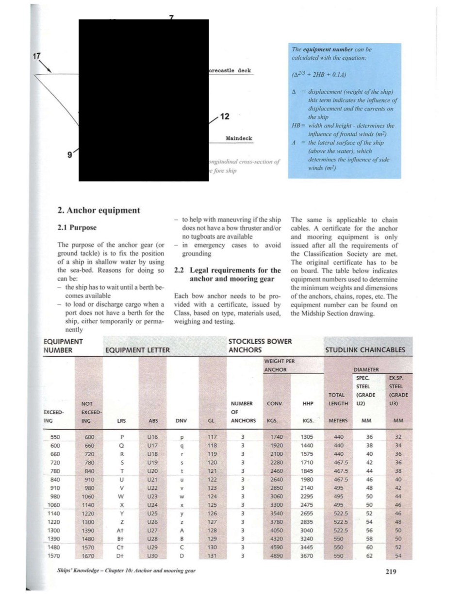 2.2 Legal requirements for the anchor and mooring gear Each bow anchor needs to be provided with a certificate, issued by Class, based on type, materials used, weighing and testing. The same is applicable to chain cables. A certificate for the anchor and mooring equipment is only issued after all the requirements of the Classification Society are met. The original certificate has to be on board. The table below indicates equipment numbers used to determine the minimum weights and dimensions of the anchors, chains, ropes, etc. The equipment number can be found on the Midship Section drawing. |