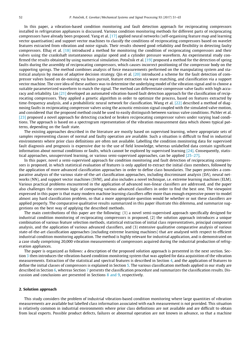 本文的结构如下:下一节描述了所提出的求解方法。第三章介绍了基于振动的状态监测系统,用于振动测量的数据采集。第4节描述了提取统计和光谱特征,以及应用特征来定义初始类。压缩机的SE在第5节中作了解释。第六节介绍了本研究中采用的各种分类方法,而第七节则介绍了分类过程,并对分类过程进行了总结,分类结果。第8节和第9节分别给出了讨论和结论.