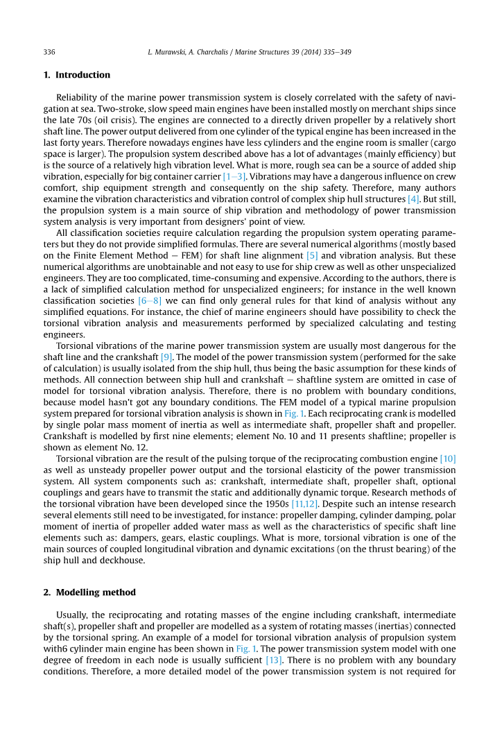 扭转振动是往复式内燃机的脉冲转矩[10]以及不稳定的螺旋桨功率输出和动力传动系统扭转弹性造成的结果。自20世纪50年代以来,所有系统组件,如:曲轴,中间轴,传动轴,可选联轴器和齿轮必须传递静态和额外的动力扭矩研究方法的扭转振动已经发展[11,12]尽管如此强烈的研究仍有几个元素需要进行调查,例如:螺旋桨阻尼,气缸阻尼,螺旋桨增加水量的极惯性矩以及特定轴线元件的特性,如:阻尼器,齿轮,弹性联轴器。更重要的是,扭转振动是船体和甲板室耦合纵向振动和动力激励(推力轴承)的主要来源之一。