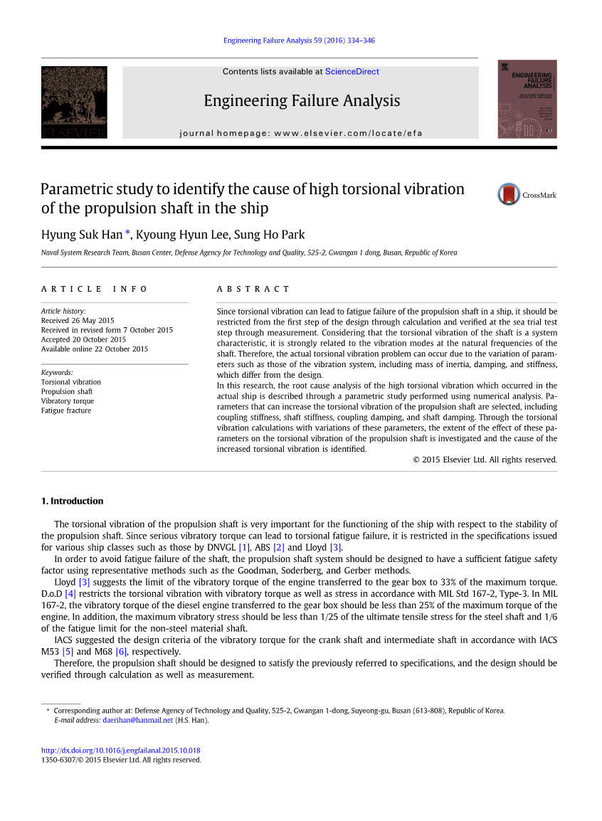 推进轴的扭转振动对于船的功能和推进轴的稳定性非常重要。由于严重的振动扭矩会导致扭转疲劳破坏,所以它受到DNVGL、ABS和Lloyd等船级社所颁布的规范的限制。为了避免轴的疲劳破坏,推进轴系的设计应采用Goodman、Soderberg和Gerber等有代表性的方法,使其具有足够的疲劳安全系数。劳埃德等人建议的限制振动扭矩的发动机转移到齿轮箱的33%的最大扭矩。D.o.d按照MILStd167-2Type-3用振动扭矩和压力限制扭转振动。在MIL167-2中,柴油机传递到变速箱的振动扭矩应小于发动机最大扭矩的25%。此外,钢轴的最大振动应力应小于极限拉应力的1/25,非钢材料轴系的最大振动应力应小于极限拉应力的1/6。根据IACSM53和M68,IACS分别提出了曲轴和中间轴振动扭矩的设计准则。因此,推进轴的设计应满足前面提到的规范要求,并通过计算和测量进行验证。