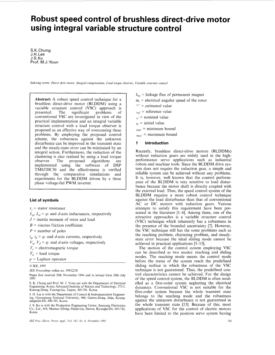近年来,无刷直接驱动电机(BLDMS)在工业机器人、机床等高性能伺服领域得到了广泛的应用。由于无刷直流电机驱动系统不需要减速齿轮,因此可以实现一个简单可靠的系统而不会出现任何问题。然而,众所周知,无刷直流电机的控制性能对负载扰动非常敏感,因为电机轴直接与外部负载耦合。因此,无刷直流电机的速度控制系统比传统的带减速齿轮的交直流电机对负载扰动的控制要求更高。文献[1-6]提出了满足这一要求的各种尝试。其中,一种具有吸引力的方法是变结构控制(VSC)技术,该技术在有界不确定性的情况下具有固有的鲁棒性[7]。然而,由于在实际应用中无法达到理想的滑模,变结构控制技术仍存在着诸如到达问题、颤振问题和稳态误差等问题[5-13]。