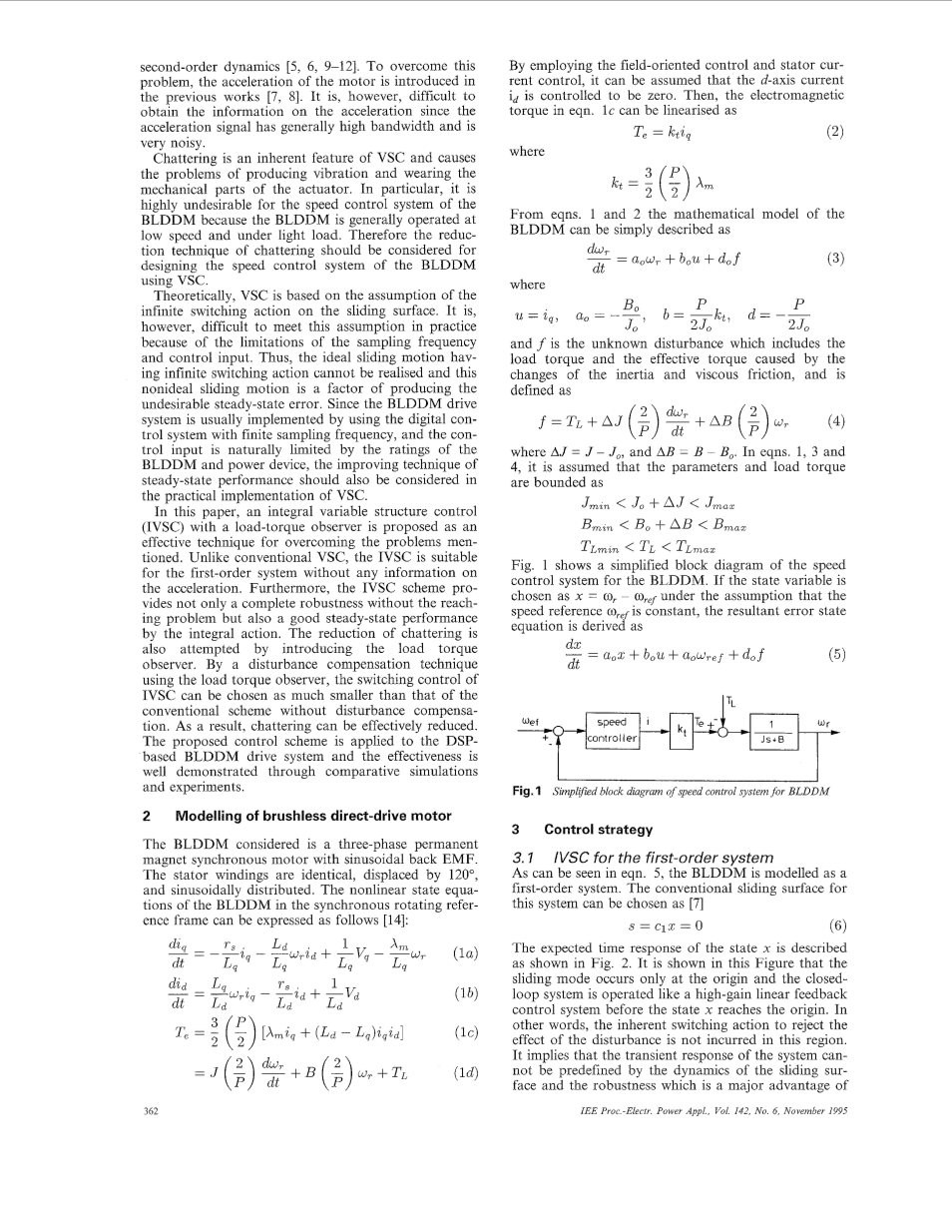 本文提出了一种带负载转矩观测器的积分变结构控制方法,它是克服上述问题的有效方法。与传统的V SC不同,IVSC适用于一阶系统,不需要任何加速度信息。此外,该方案不仅具有完全的鲁棒性,且不存在到达问题,而且具有良好的稳态性能。通过引入负载转矩,也可以减小颤振。