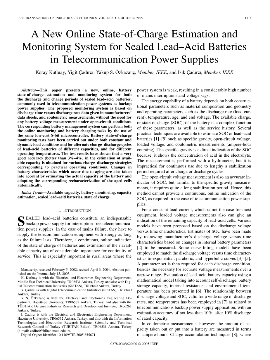 EALED铅酸电池是无中断电信电源不可或缺的备用电源。在电源故障的情况下,只要故障持续,它们就必须为电信设备提供能量。因此,连续的在线指示电池的充电状态和估计其可用容量对于服务的连续性是相当重要的。这在农村地区尤为重要